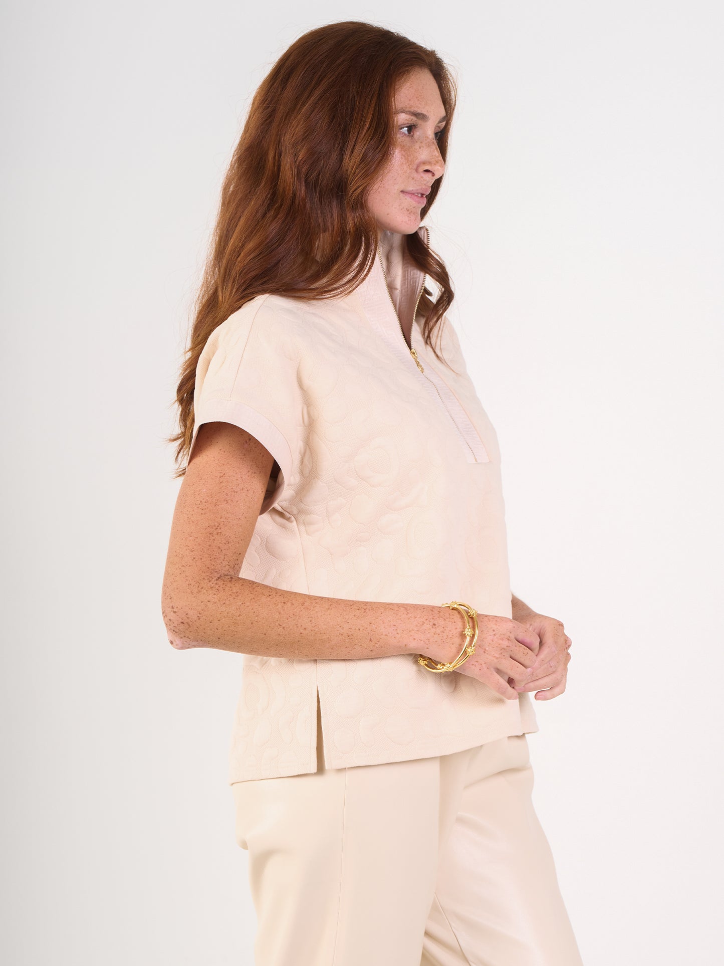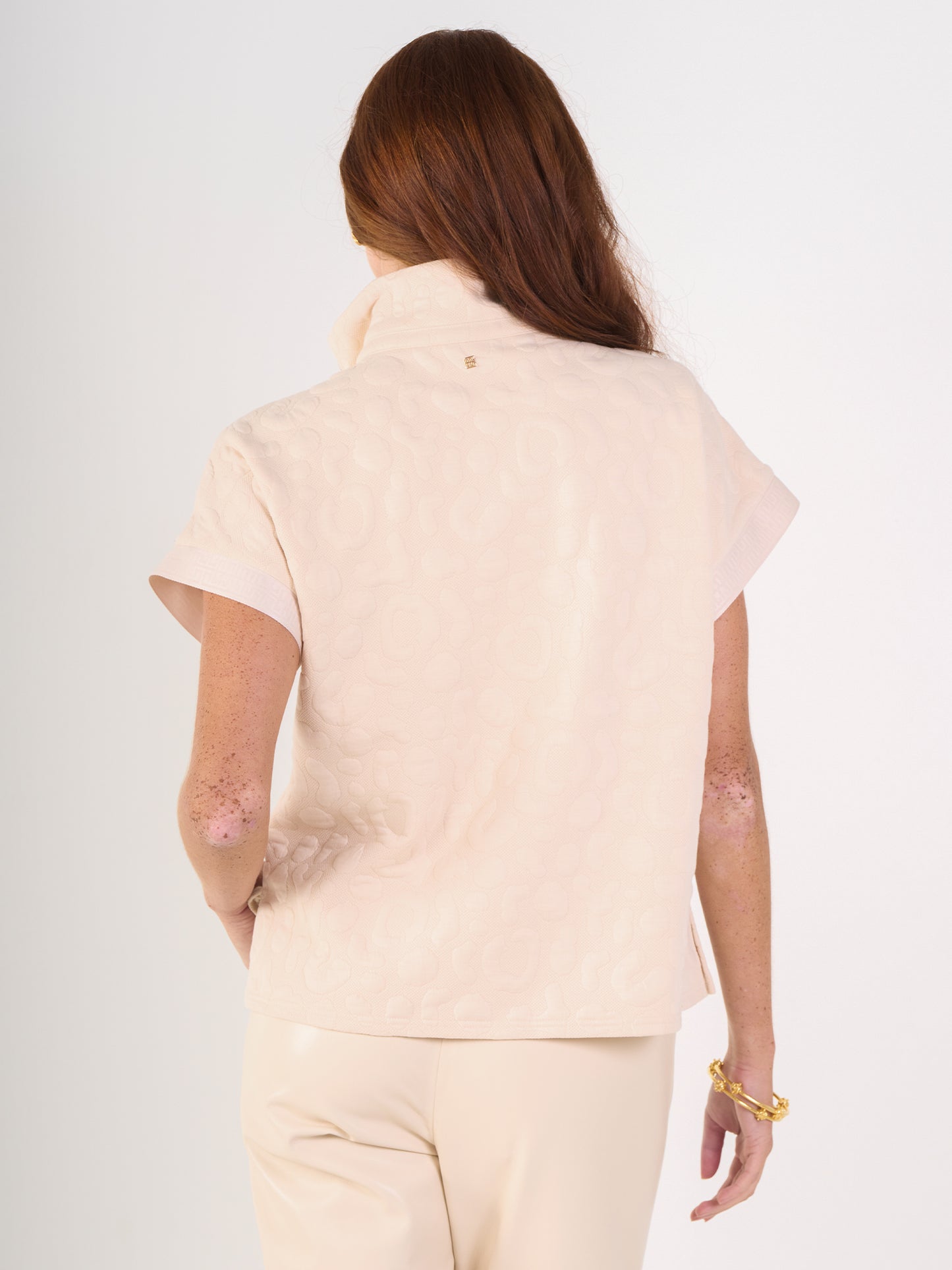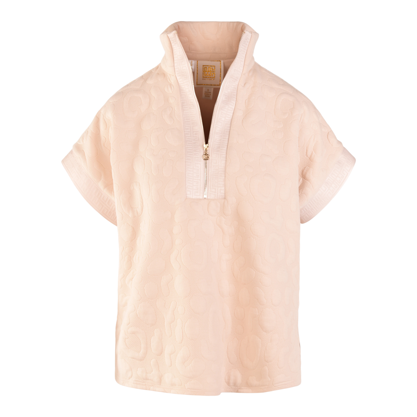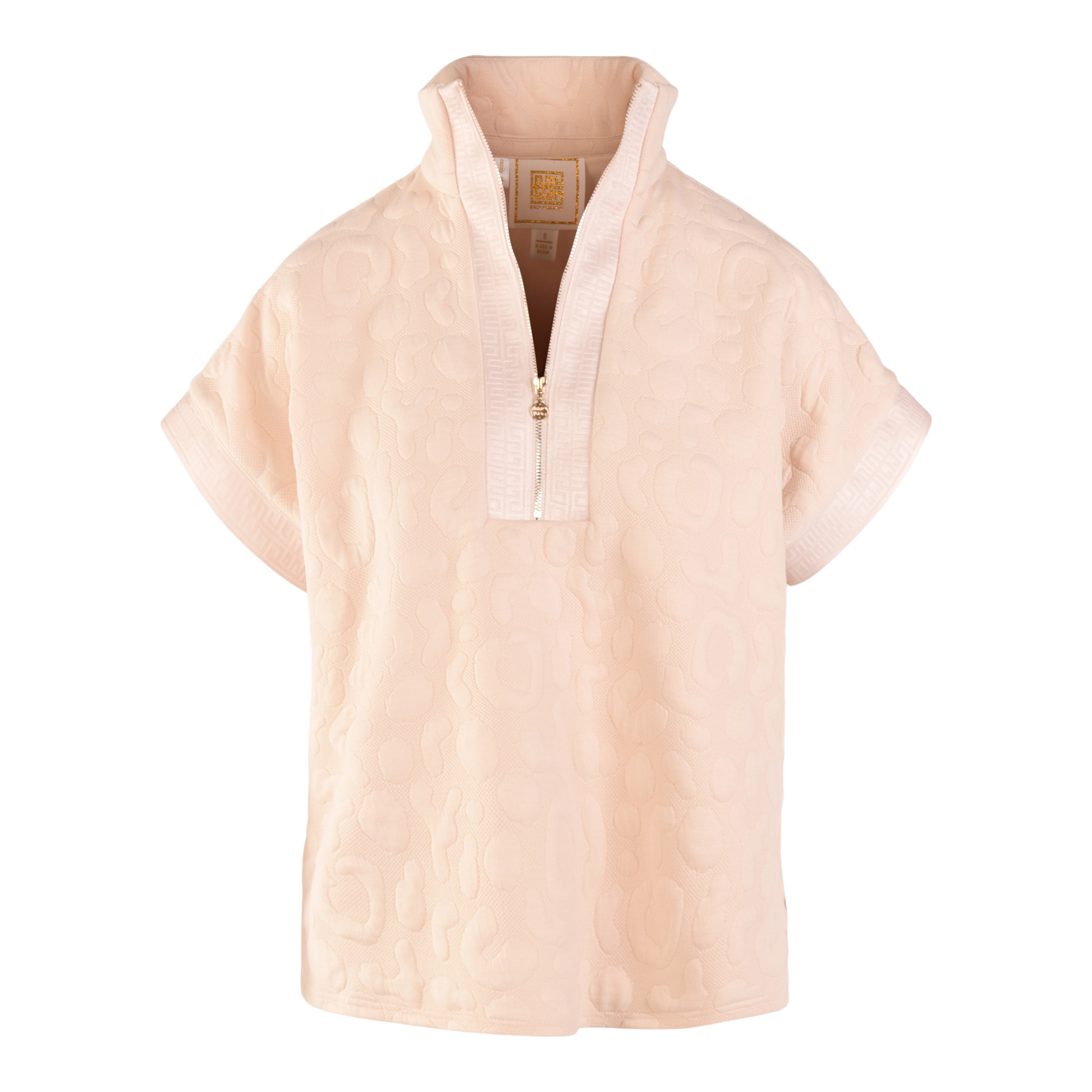 A classic style that exudes sporty sophistication, the Poppy Pullover in Sandstone Cheetah is a staple for any occasion! Everything you love about the Poppy style reimagined in a 3/4 zip collar and short dolman style sleeves complimented by contrasting trim. With signature embossed cheetah fabric and a slightly tailored fit, this top provides all the comfort and effortless style! Tuck it into the Sandshell Vegan Leather Tailored Short for a chic, monochromatic look!