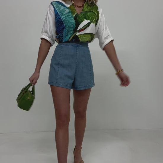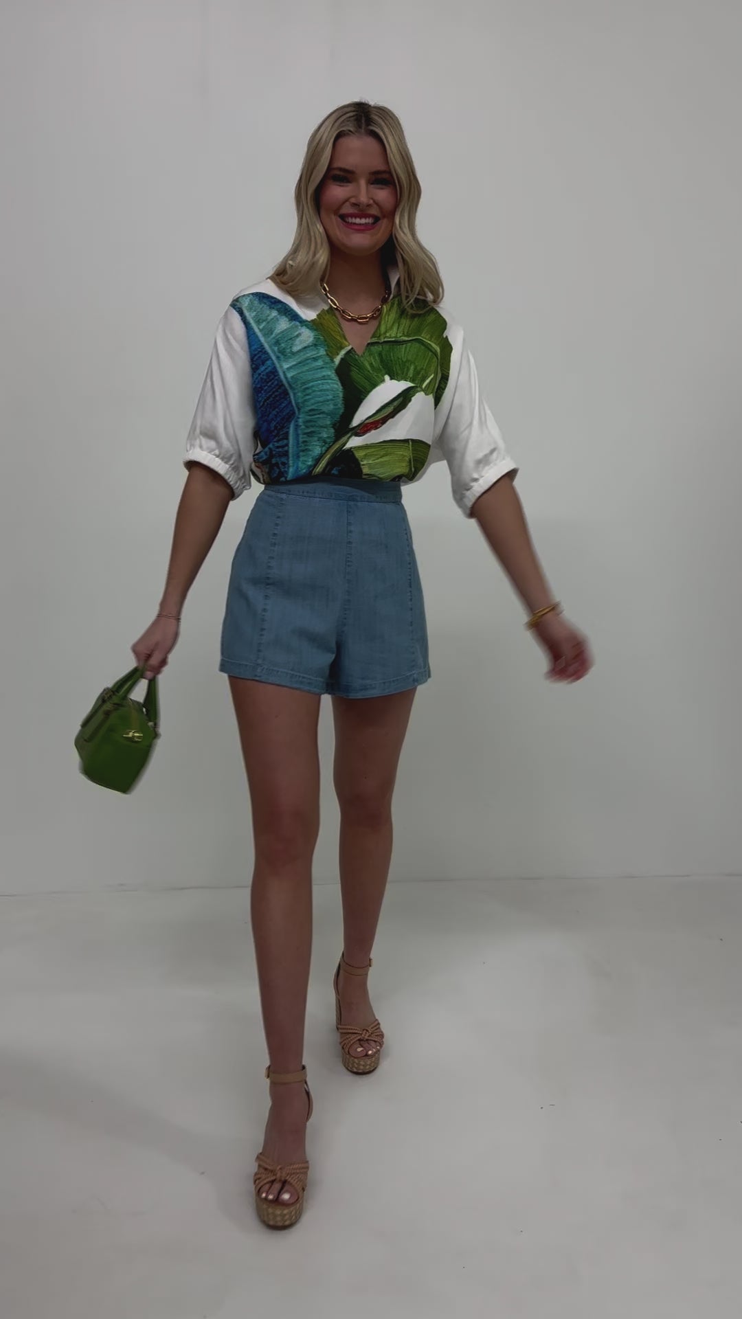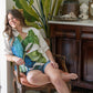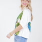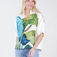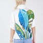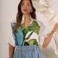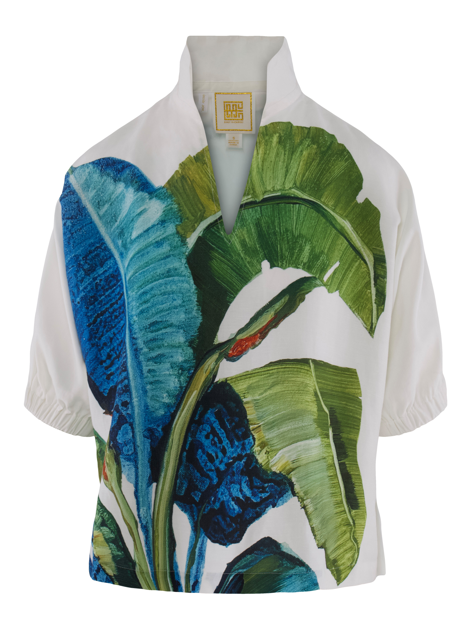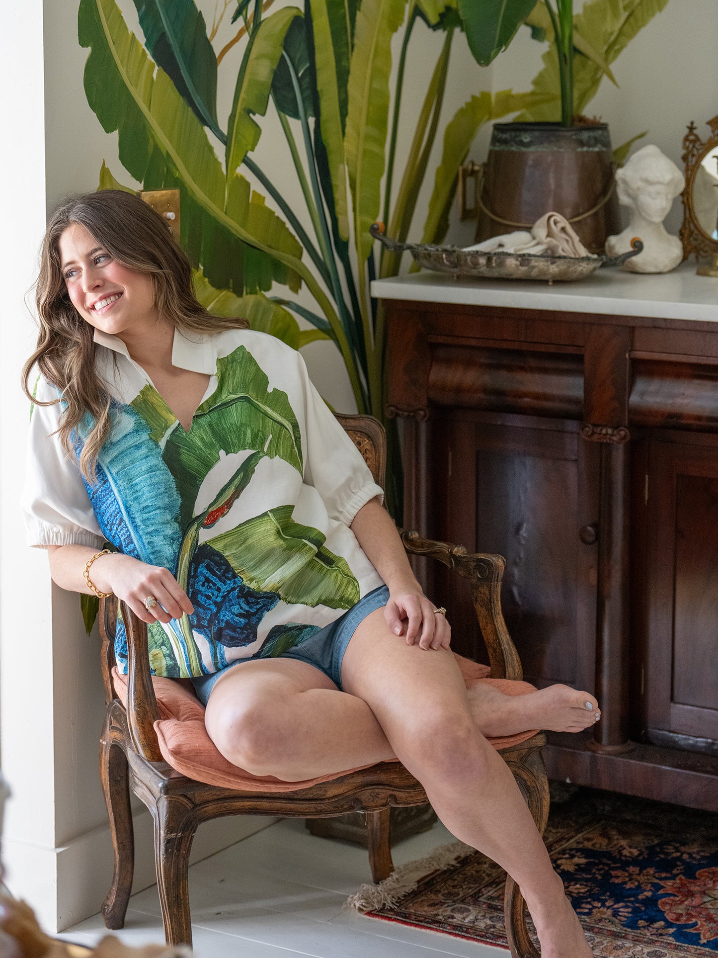 Where art meets effortless style—this one-of-a-kind blouse turns a canvas into clothing. Featuring a loose-fitting silhouette with loose elastic dolman sleeves and a structured stand collar, the Poppy top Bellamy Leaves, balances laid-back comfort with elevated design. The bold banana leaf print was hand-painted by local Savannah artist, Bellamy, and transformed into wearable art, bringing rich shades of green and blue to life in every brushstroke. Each piece carries the spirit of the Lowcountry—vibrant, natural, and uniquely expressive.