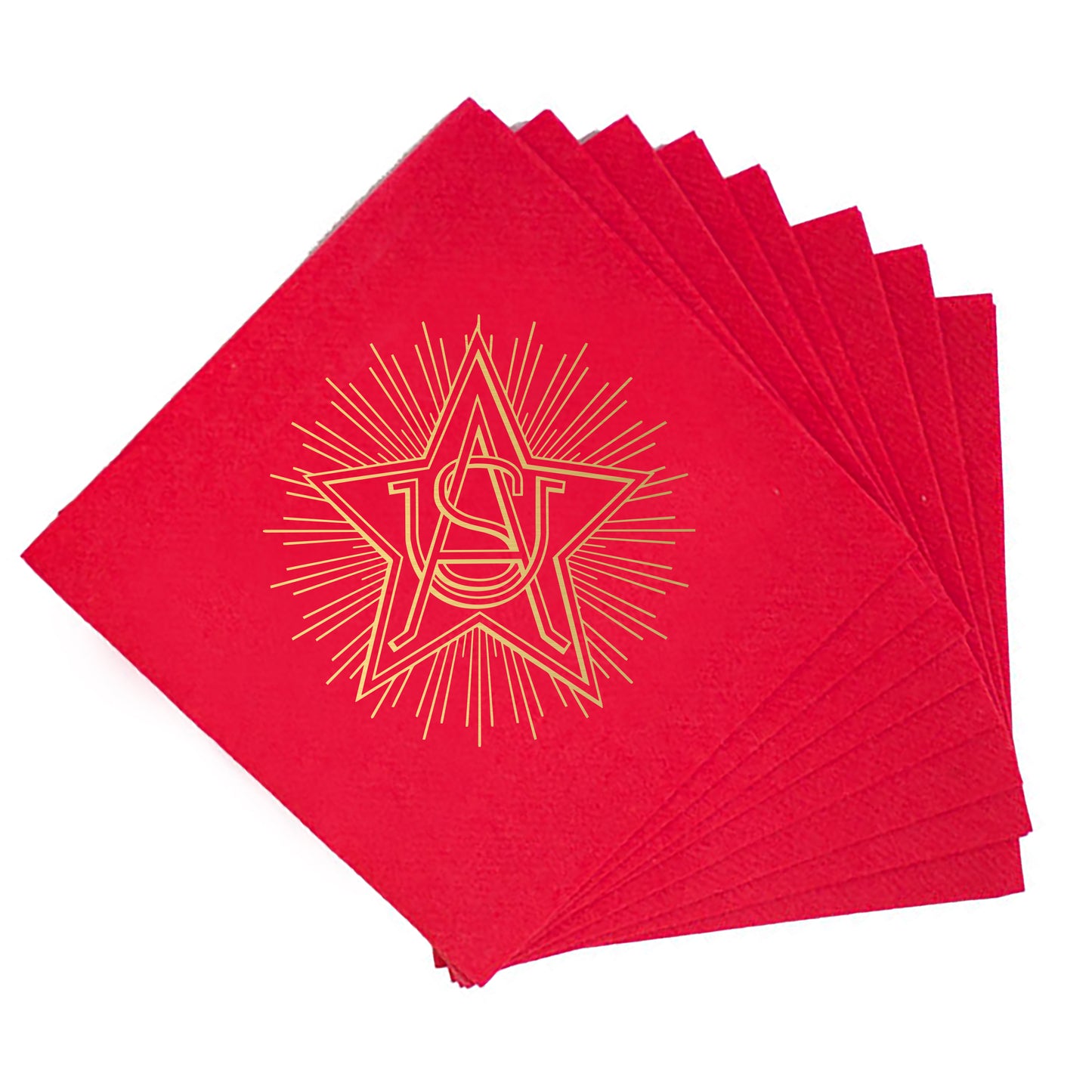 Set of 20 red cocktail napkins in faux linen paper. Features our Exclusive USA Monogram design in brushed gold on a red thick linen-like cocktail napkin.