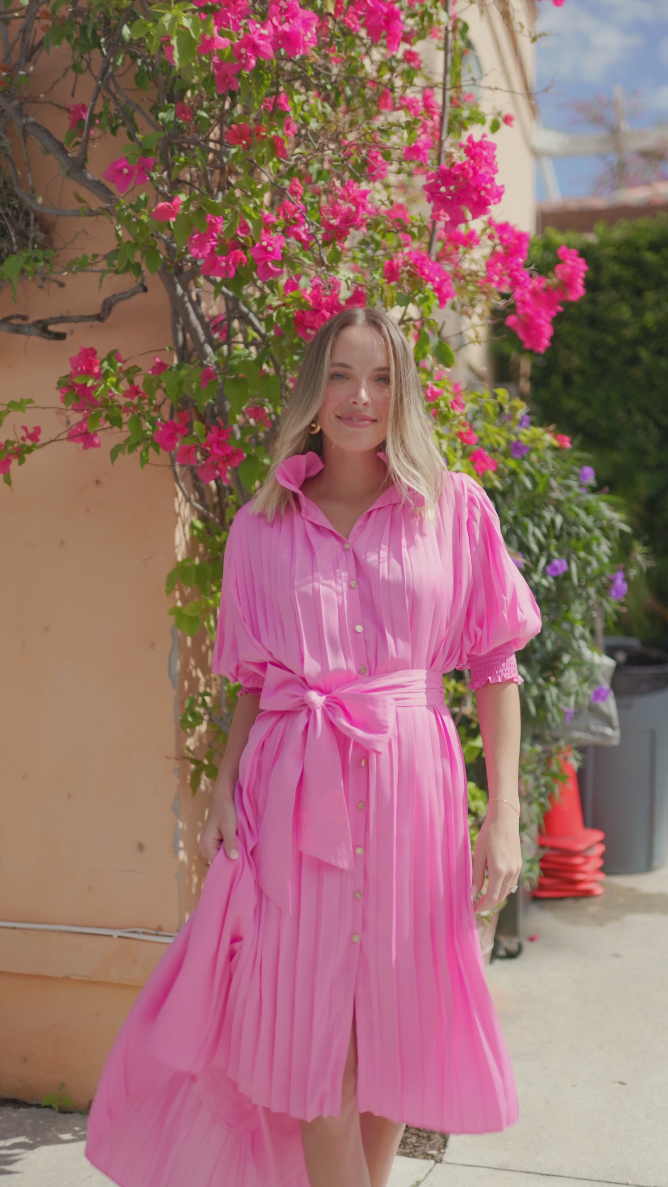 Embody romantic femininity in the Rowan Dress Fuchsia Pink. Designed for the main attraction, featuring a captivating hi-lo hem that creates a dynamic and eye-catching silhouette. The flowing fabric of delicate pleating drapes beautifully, adding a touch of drama with every step. A self-tying belt cinches at the waist, creating a flattering and defined shape. A ruffle stand collar and puff sleeves with elastic cuffs adds a touch of playful detail and romantic charm. Signature gold button closures provide a luxurious accent, enhancing the dress's refined appeal. Perfect for your next spring wedding, garden party, or Easter Sunday!