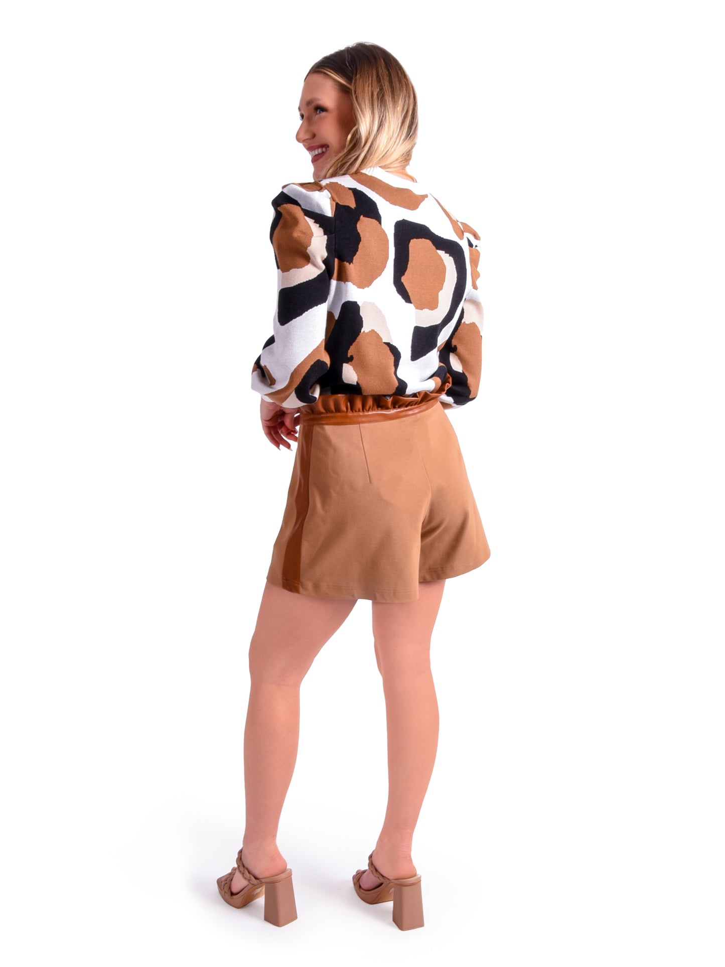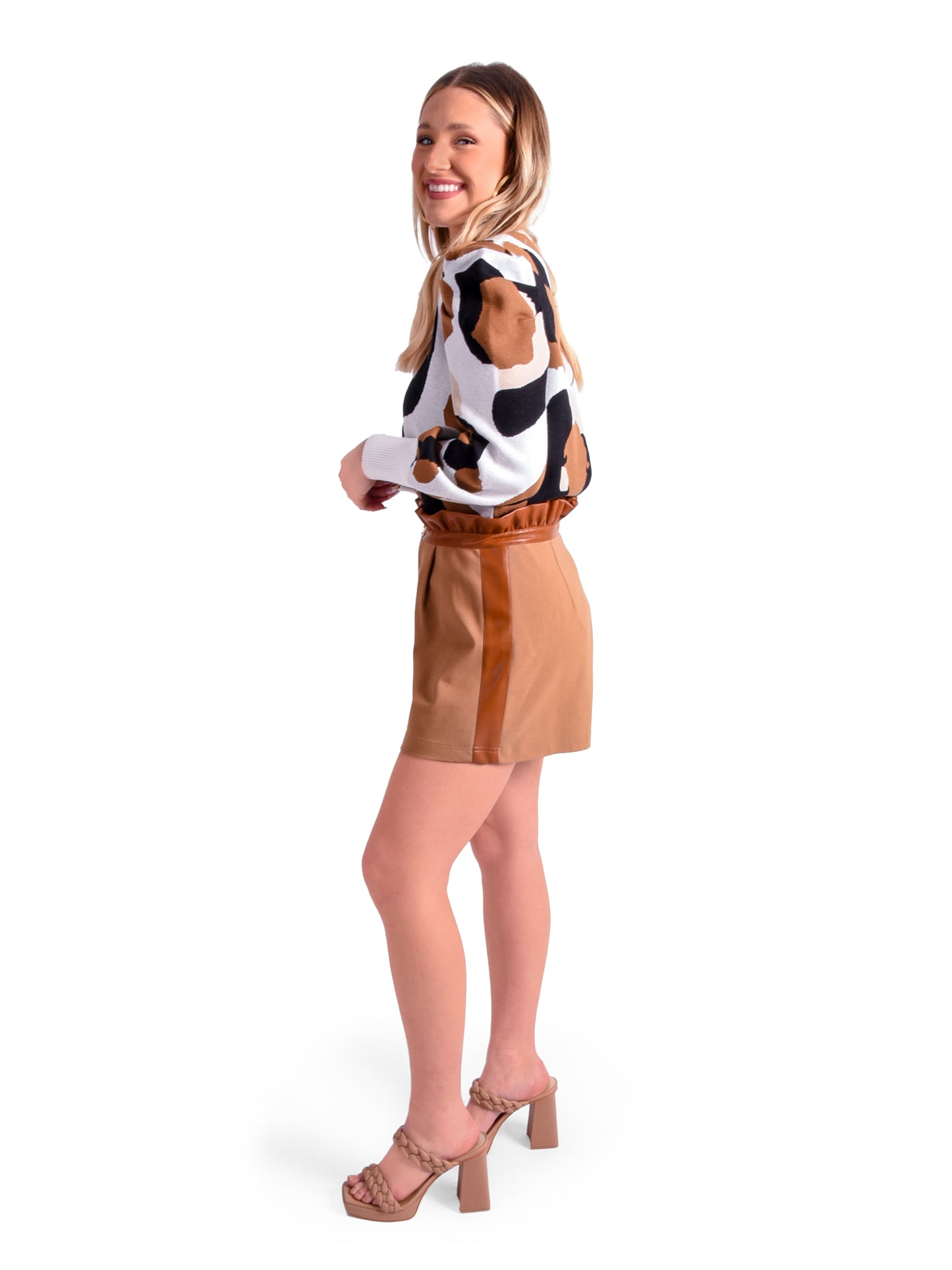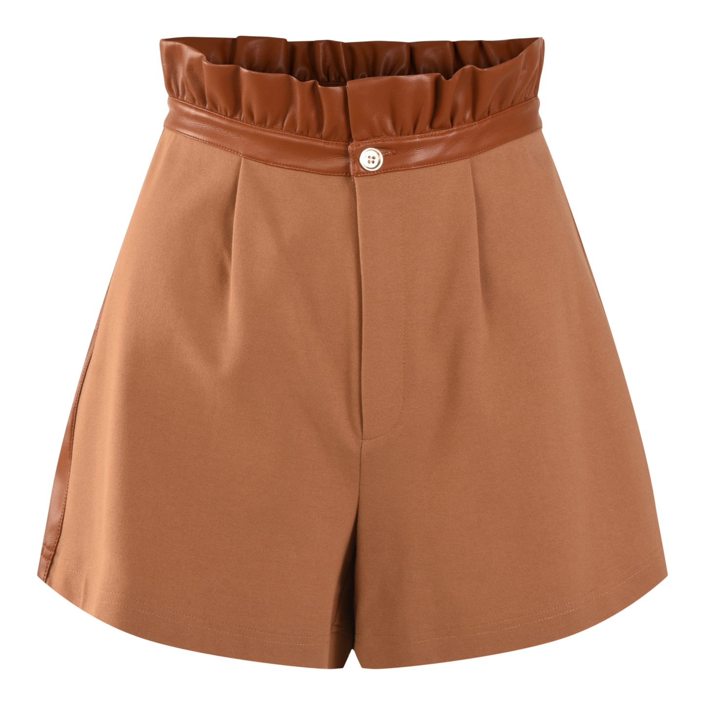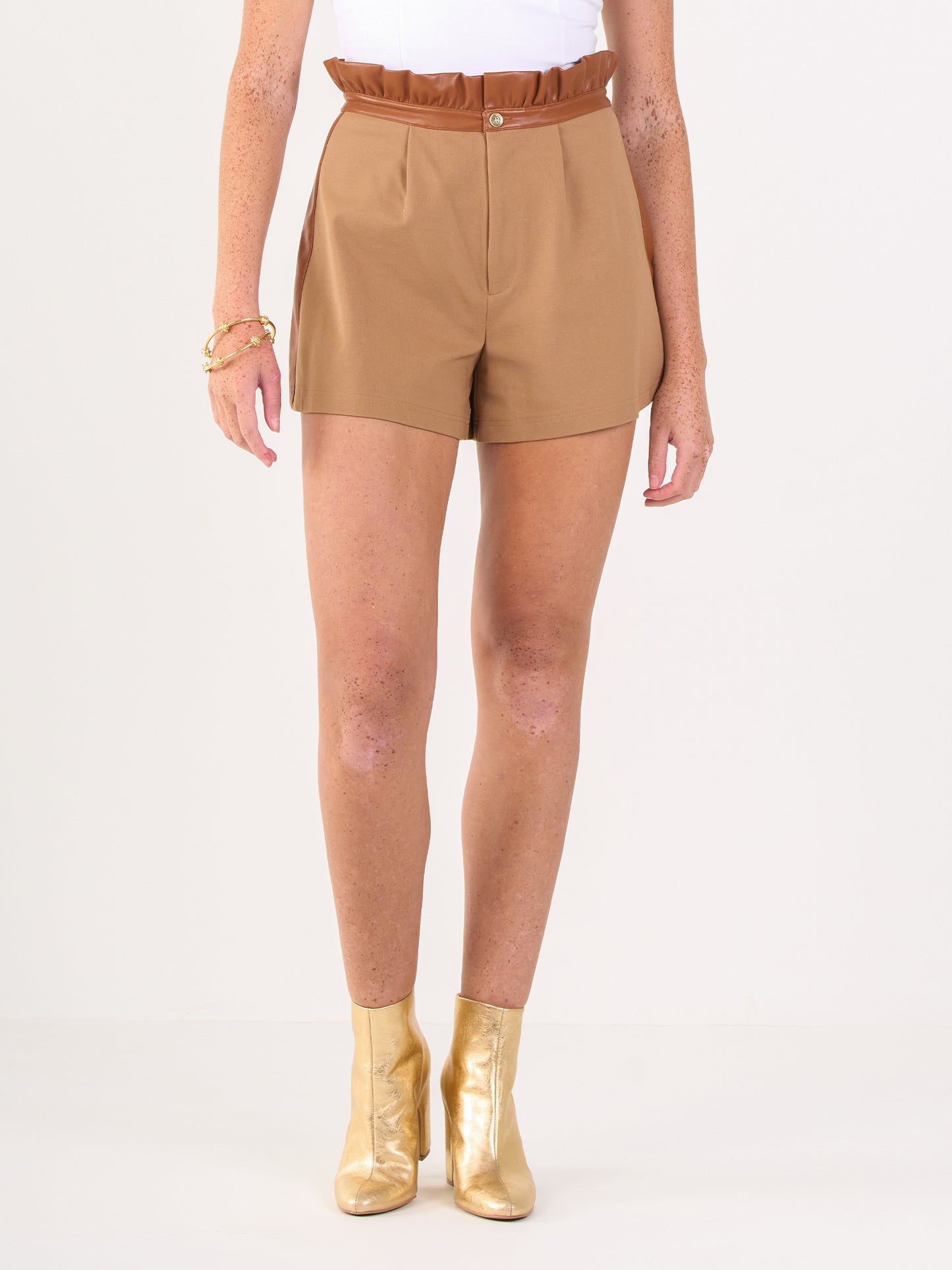 A Core style for fall that is flattering for all body-types. Stretch Ponte fabric with leather detail. Ruffle detail across the waistband so tucking in has its moment. Hits higher rise than traditional shorts.