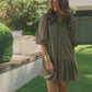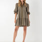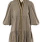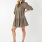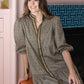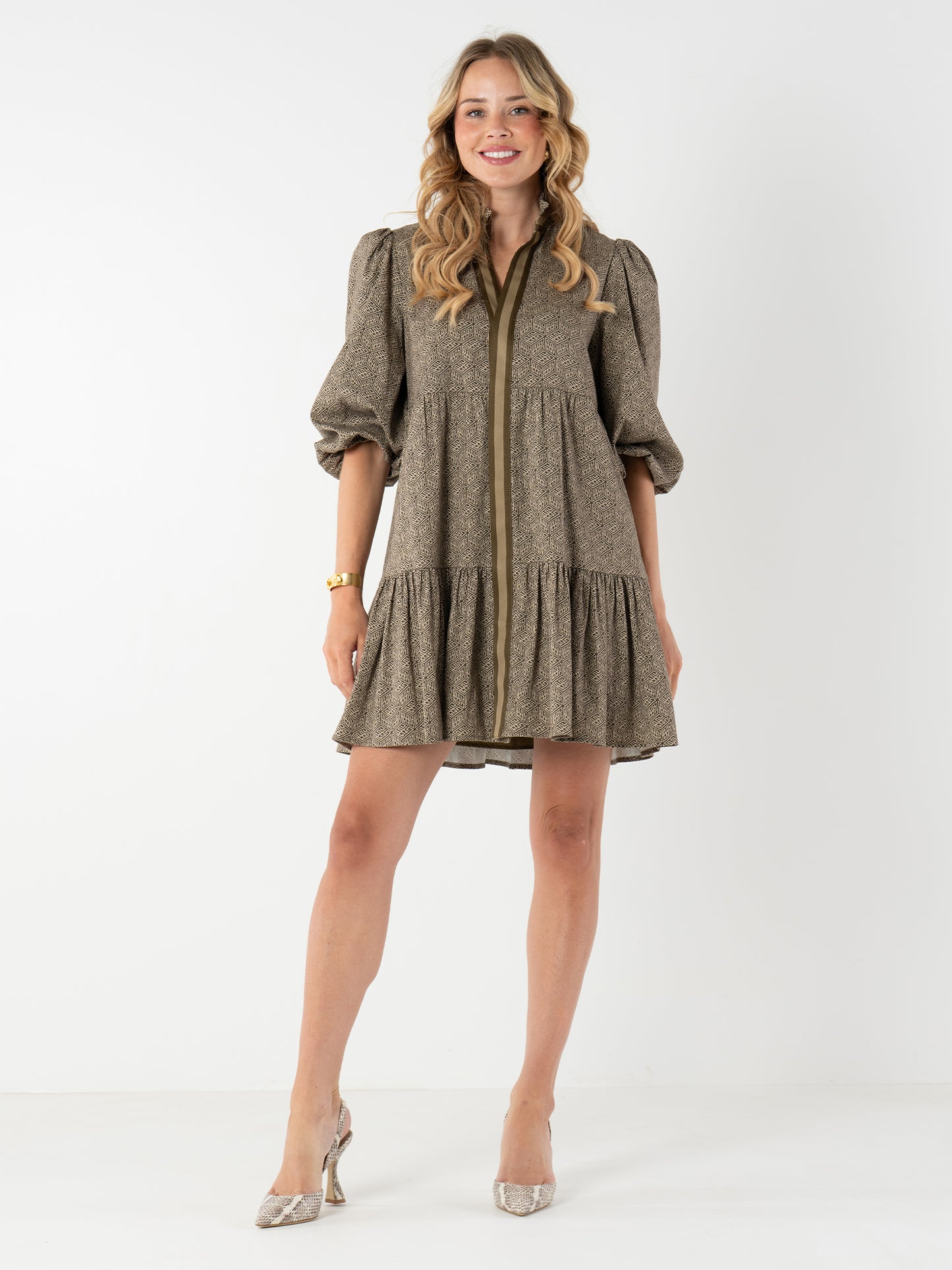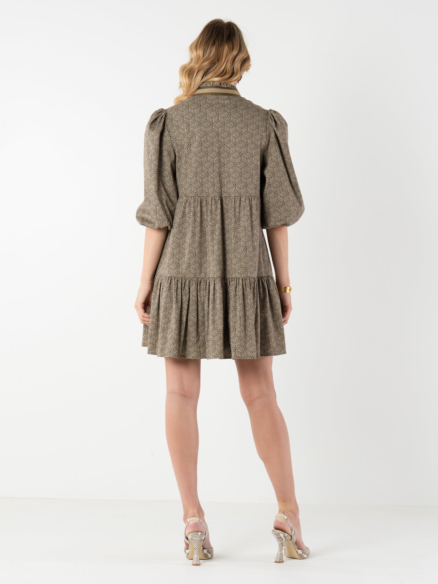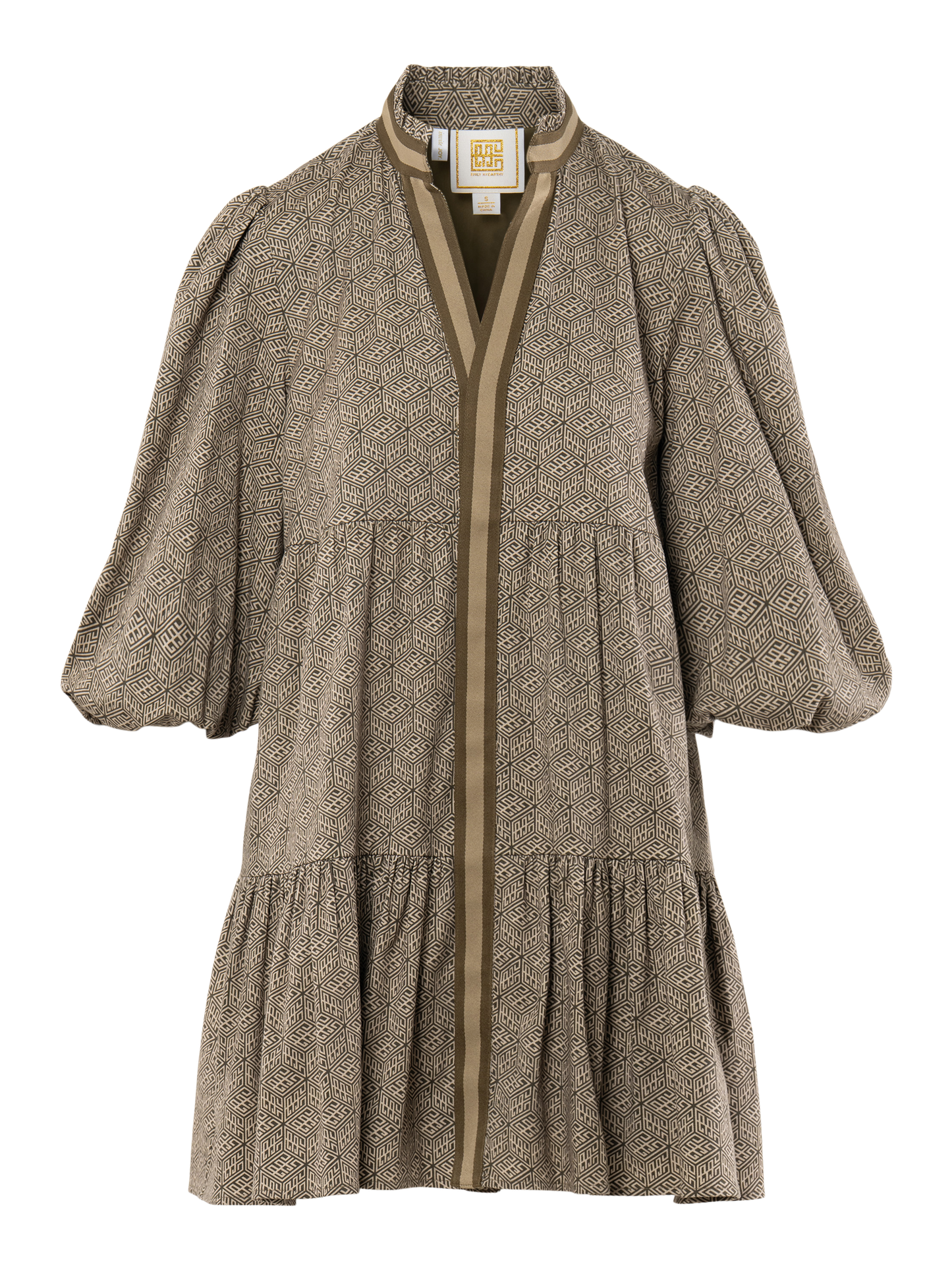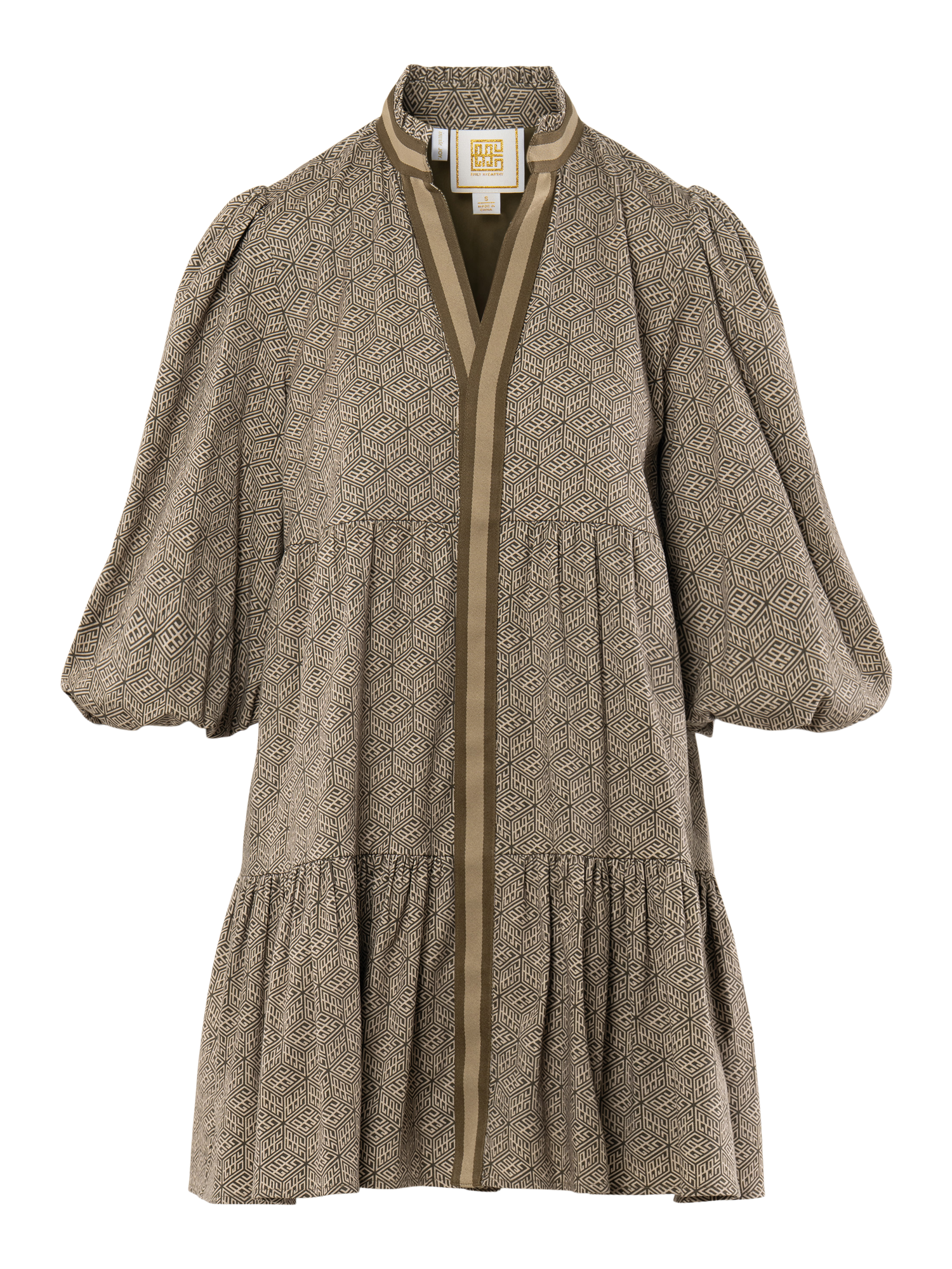 A fresh take on feminine ease, the Sadie Dress in Green Tonal Monogram features a relaxed tiered silhouette with quarter-length blouson sleeves and a concealed button-front placket trimmed in green and tan. The signature monogram print adds visual depth in a soft, tone-on-tone finish. Designed with versatility in mind, this transitional dress moves effortlessly from casual days with sneakers to cooler months paired with knee-high boots. An easy favorite for fall and beyond.