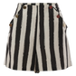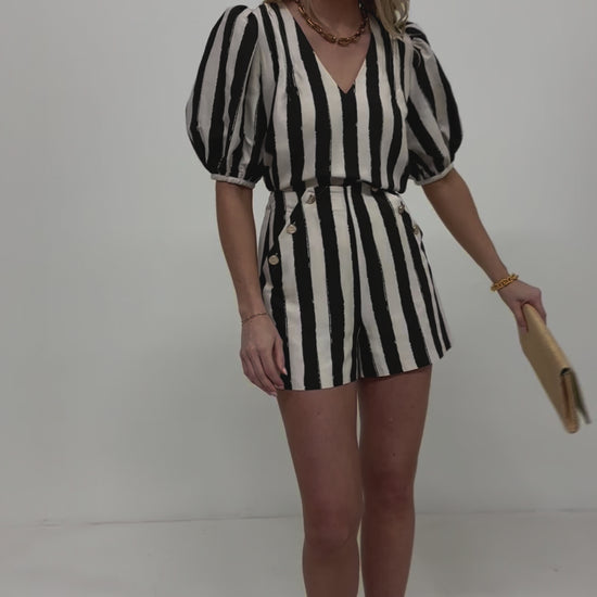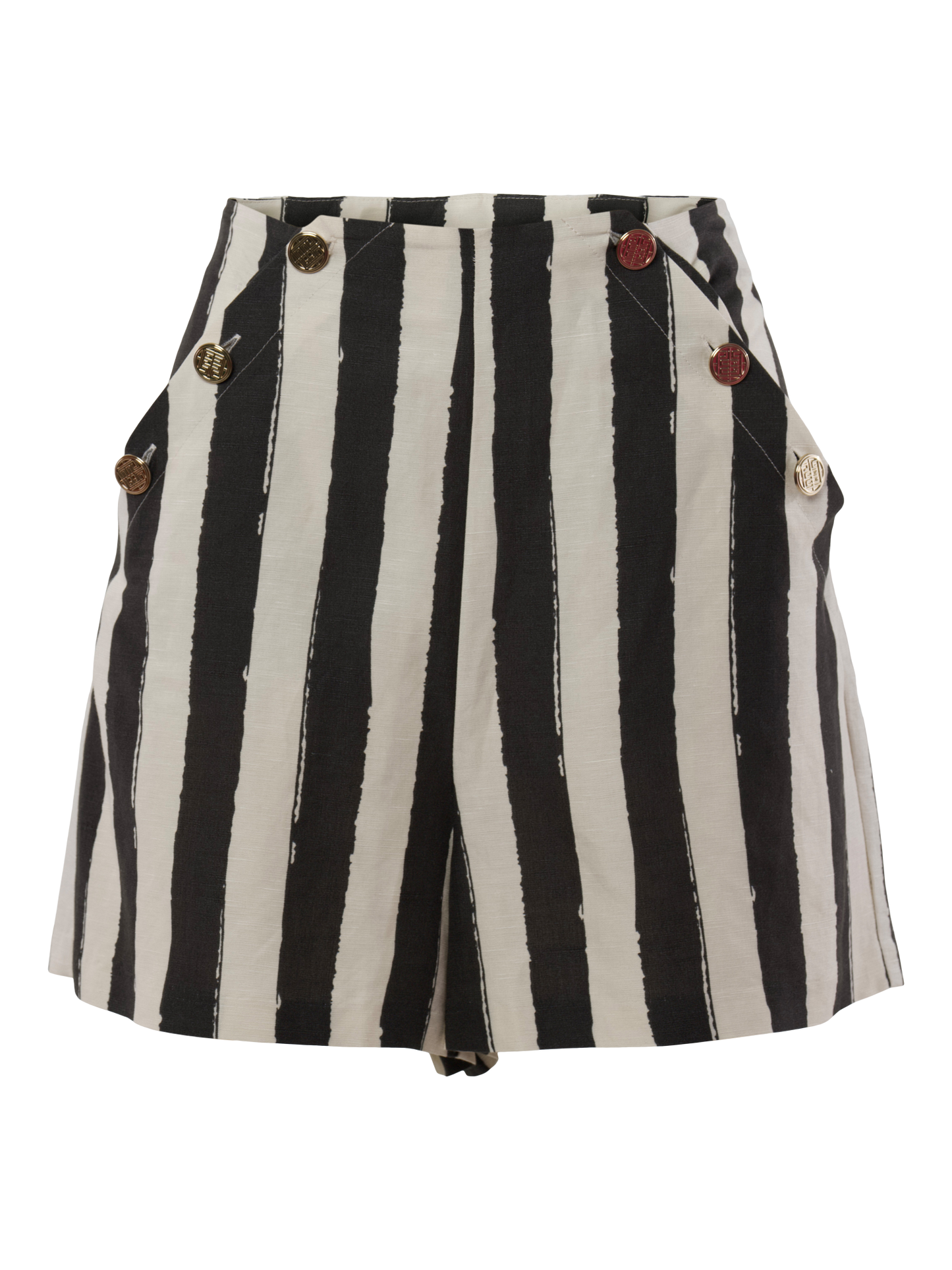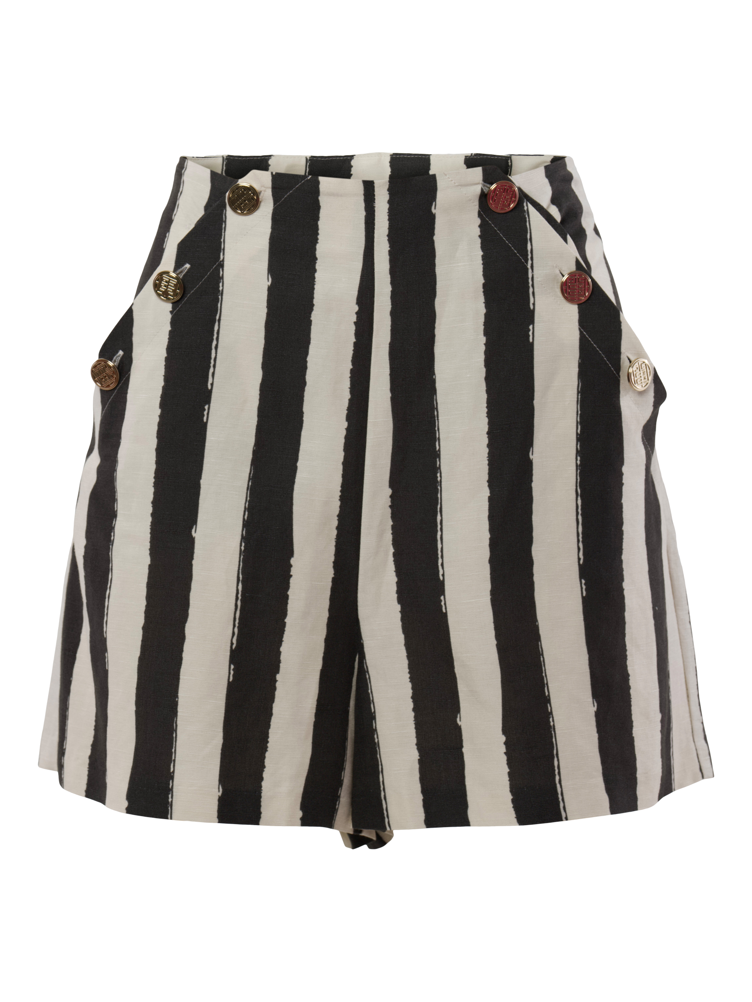 Sail into summer with standout style in the Saylor Short Stripe Noir. This high-waisted silhouette is refined with our signature gold double button closures—adding a nautical nod with a modern twist. The painterly stripe print adds artful charm and bold contrast to your warm-weather wardrobe, creating the perfect balance of structure and spontaneity. Pair with the Orchid Top in Birch for a color coordinating and polished outfit.