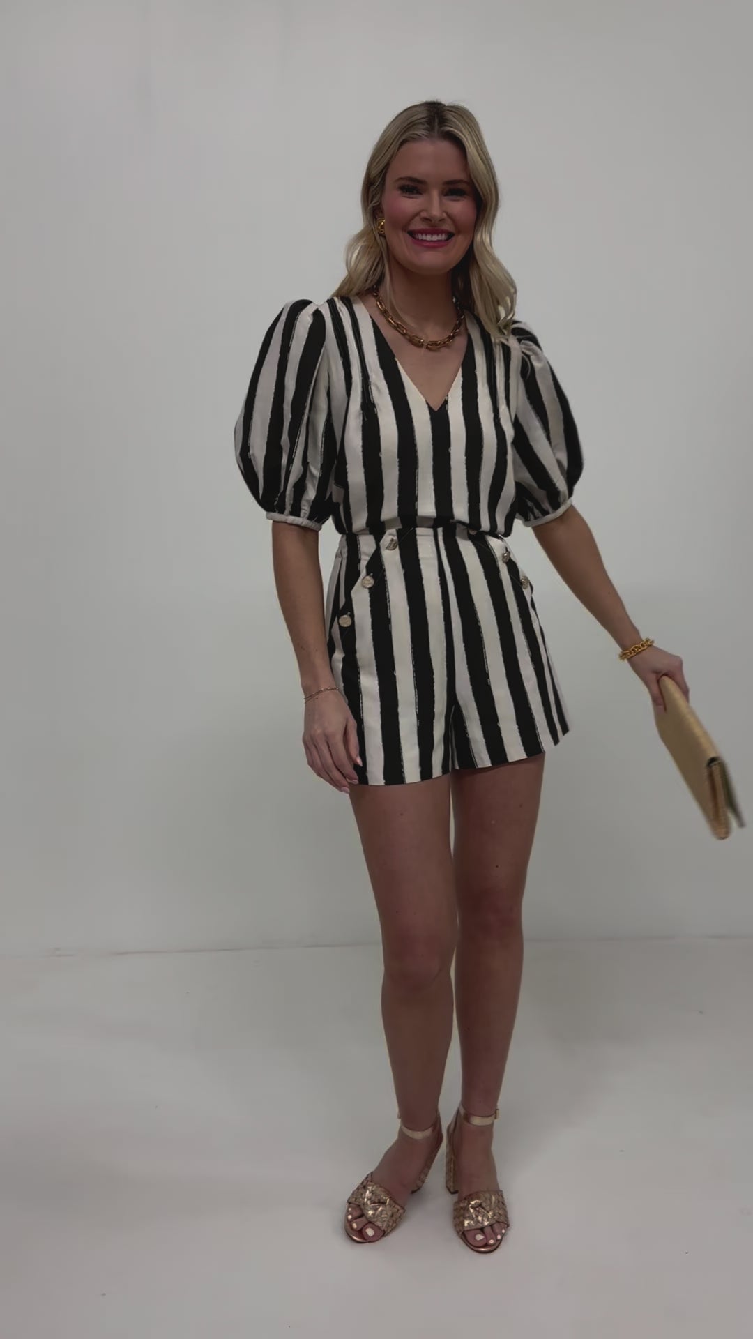 Sail into summer with standout style in the Saylor Short Stripe Noir. This high-waisted silhouette is refined with our signature gold double button closures—adding a nautical nod with a modern twist. The painterly stripe print adds artful charm and bold contrast to your warm-weather wardrobe, creating the perfect balance of structure and spontaneity. Pair with the Orchid Top in Birch for a color coordinating and polished outfit.