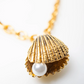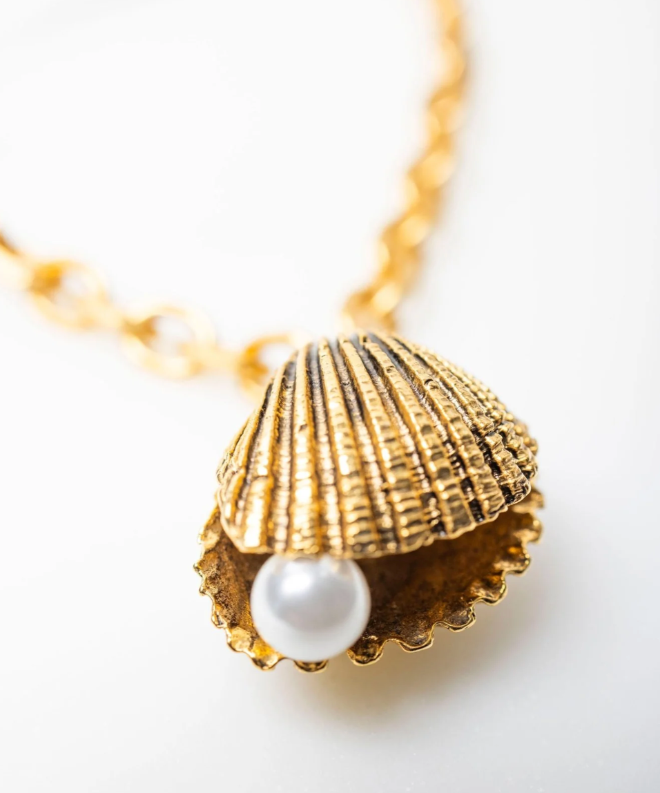 Take a walk on the whimsical side with the Shellina Necklace! This playful piece features a charming clam with a lavish pearl suspended from golden links. Bring a touch of fun and elegance to any outfit with this quirky accessory.