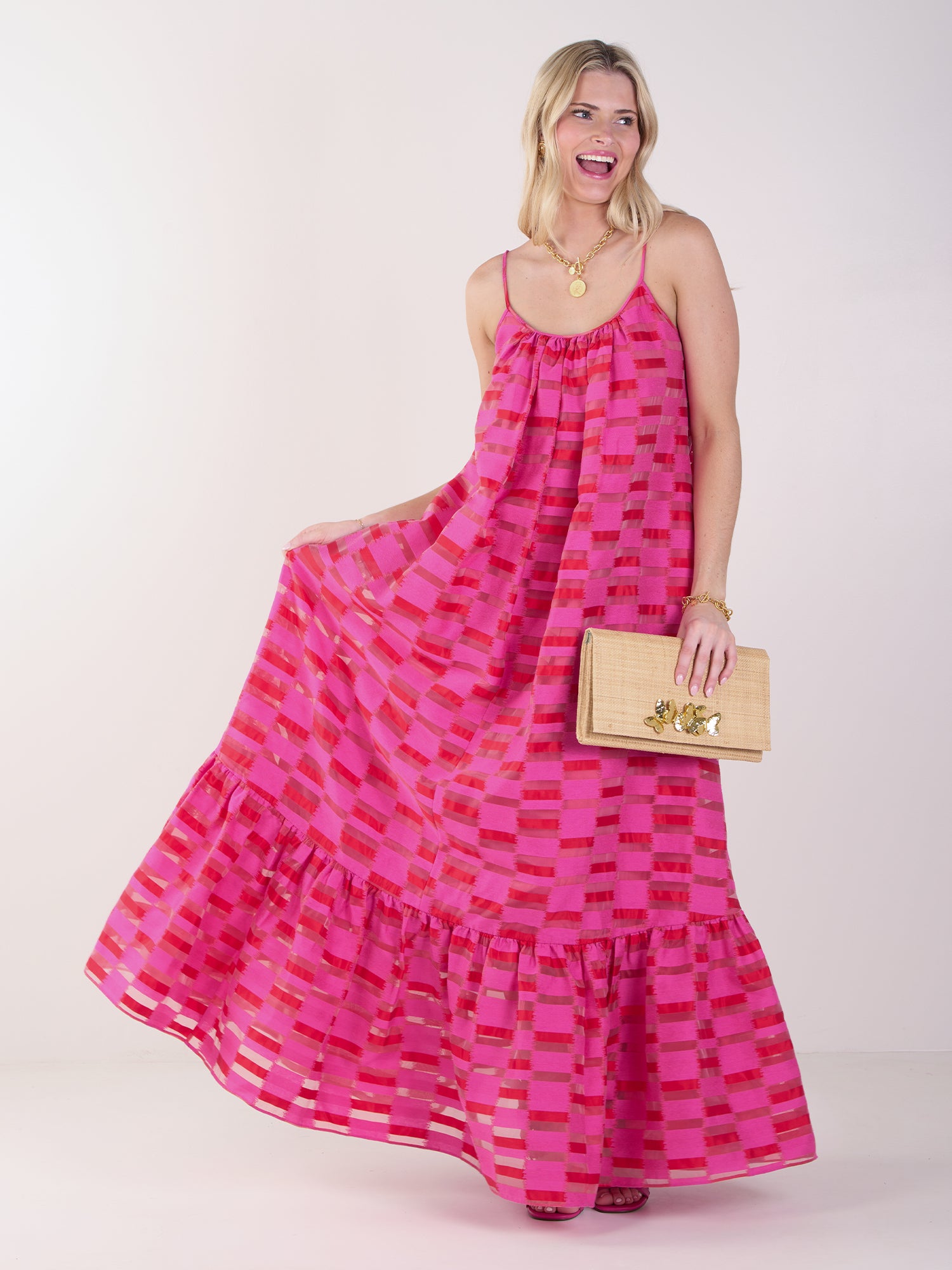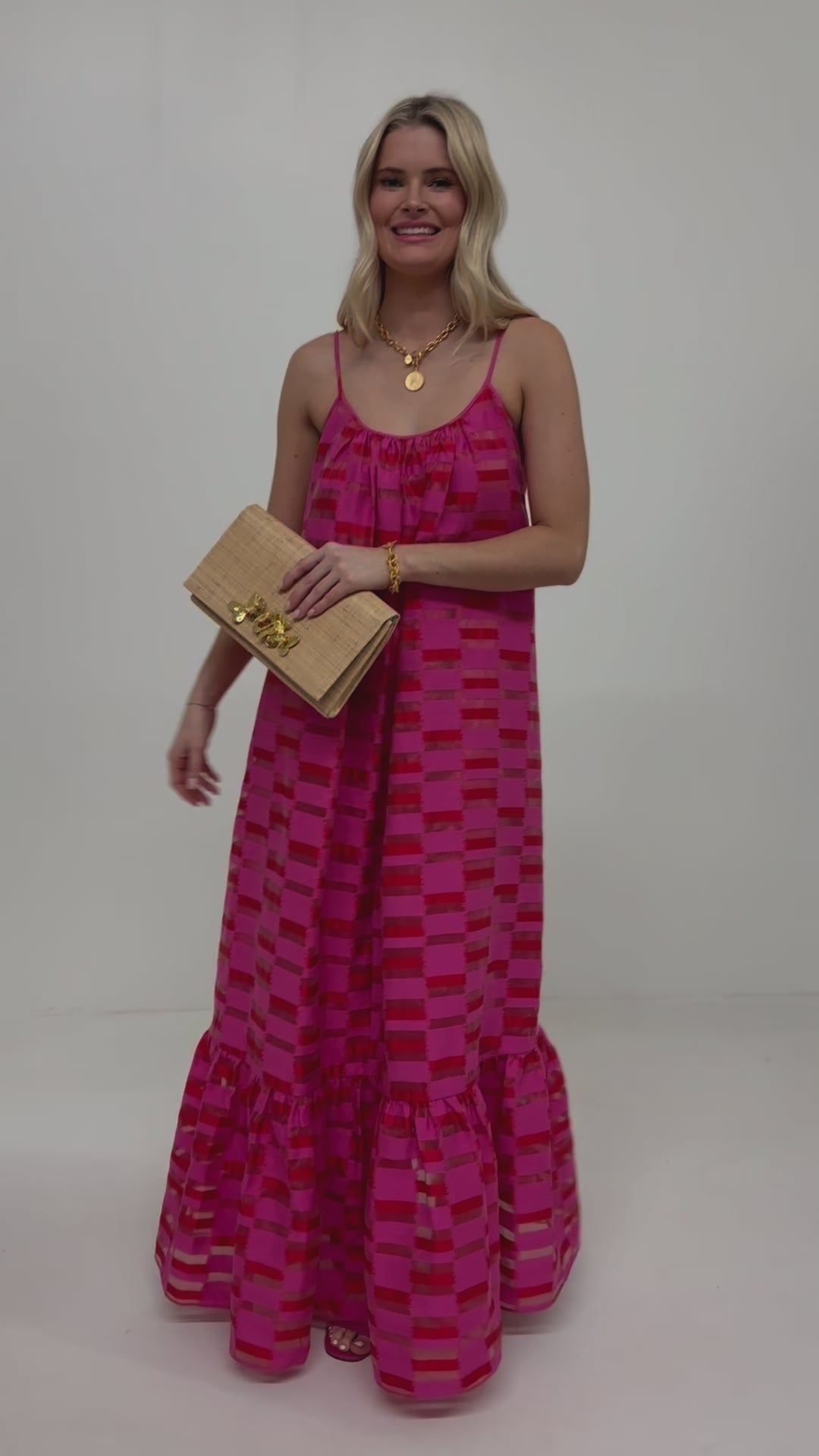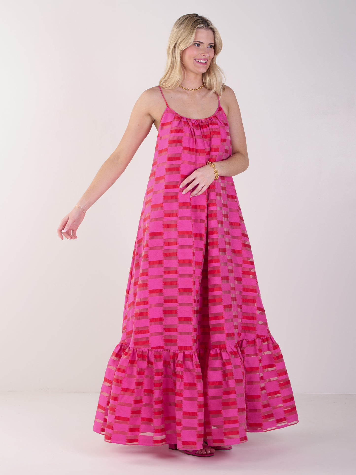 The Susannah Maxi in Sunset Stripe is a vibrant statement piece designed in a tonal pink jacquard that plays with light and texture through layered horizontal stripes. Featuring delicate spaghetti straps and a gathered scoop neckline, this dress cascades into an airy, loose-fitting silhouette that finishes with a wide ruffled hem for added movement and volume. The low scoop back adds a striking touch, making it perfect for warm-weather escapes or event dressing with an effortless twist.