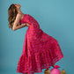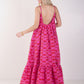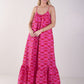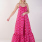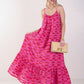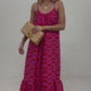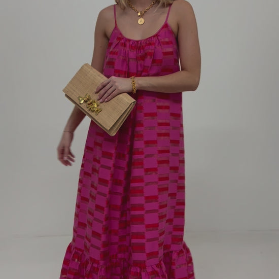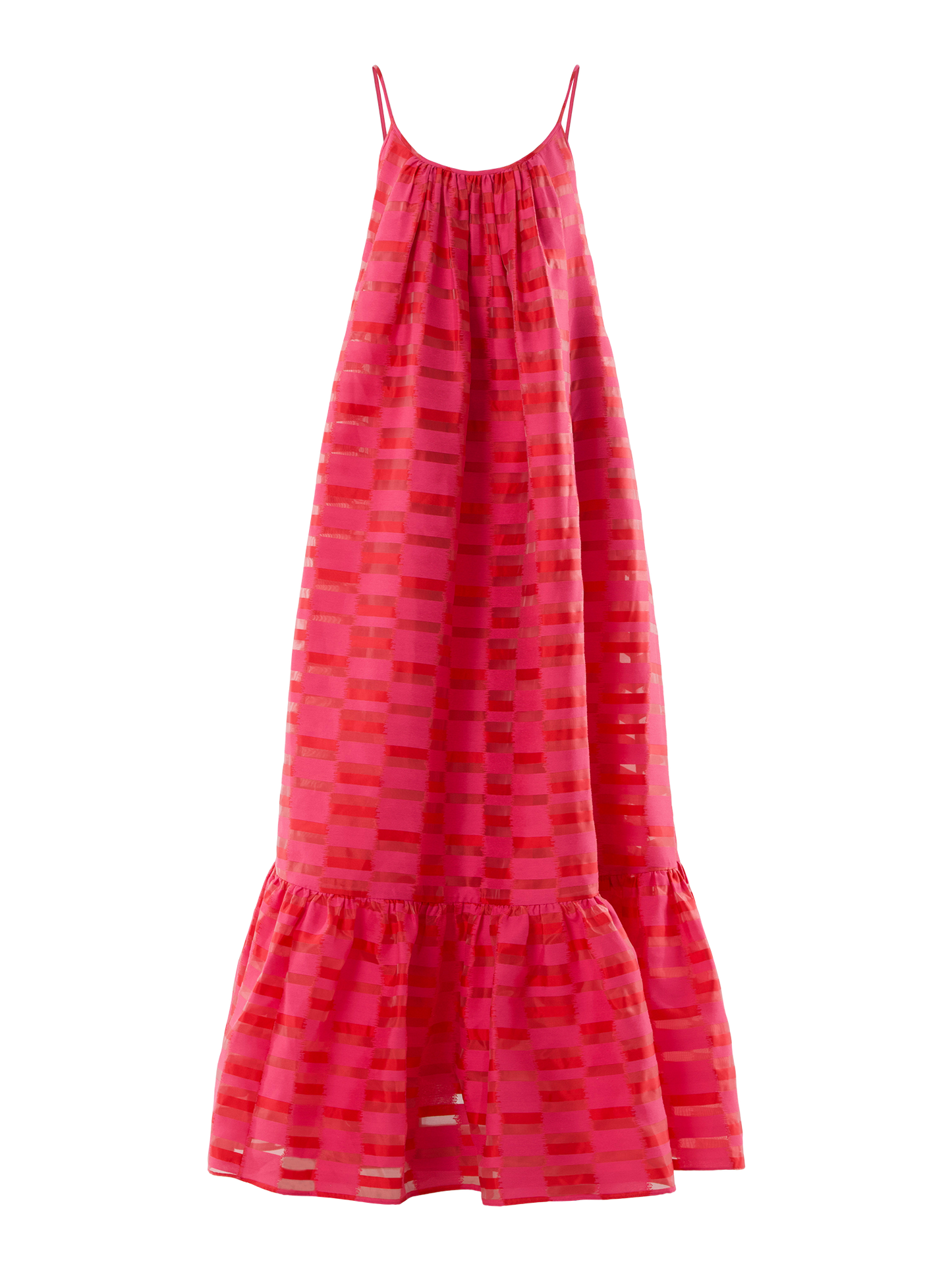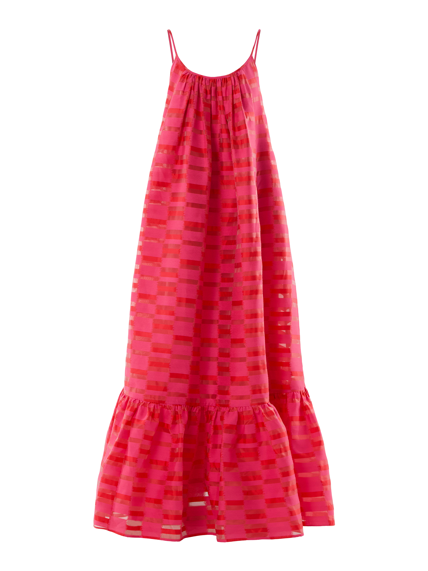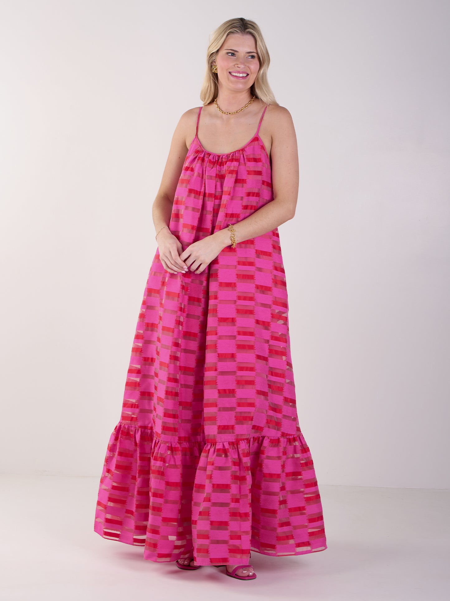 The Susannah Maxi in Sunset Stripe is a vibrant statement piece designed in a tonal pink jacquard that plays with light and texture through layered horizontal stripes. Featuring delicate spaghetti straps and a gathered scoop neckline, this dress cascades into an airy, loose-fitting silhouette that finishes with a wide ruffled hem for added movement and volume. The low scoop back adds a striking touch, making it perfect for warm-weather escapes or event dressing with an effortless twist.