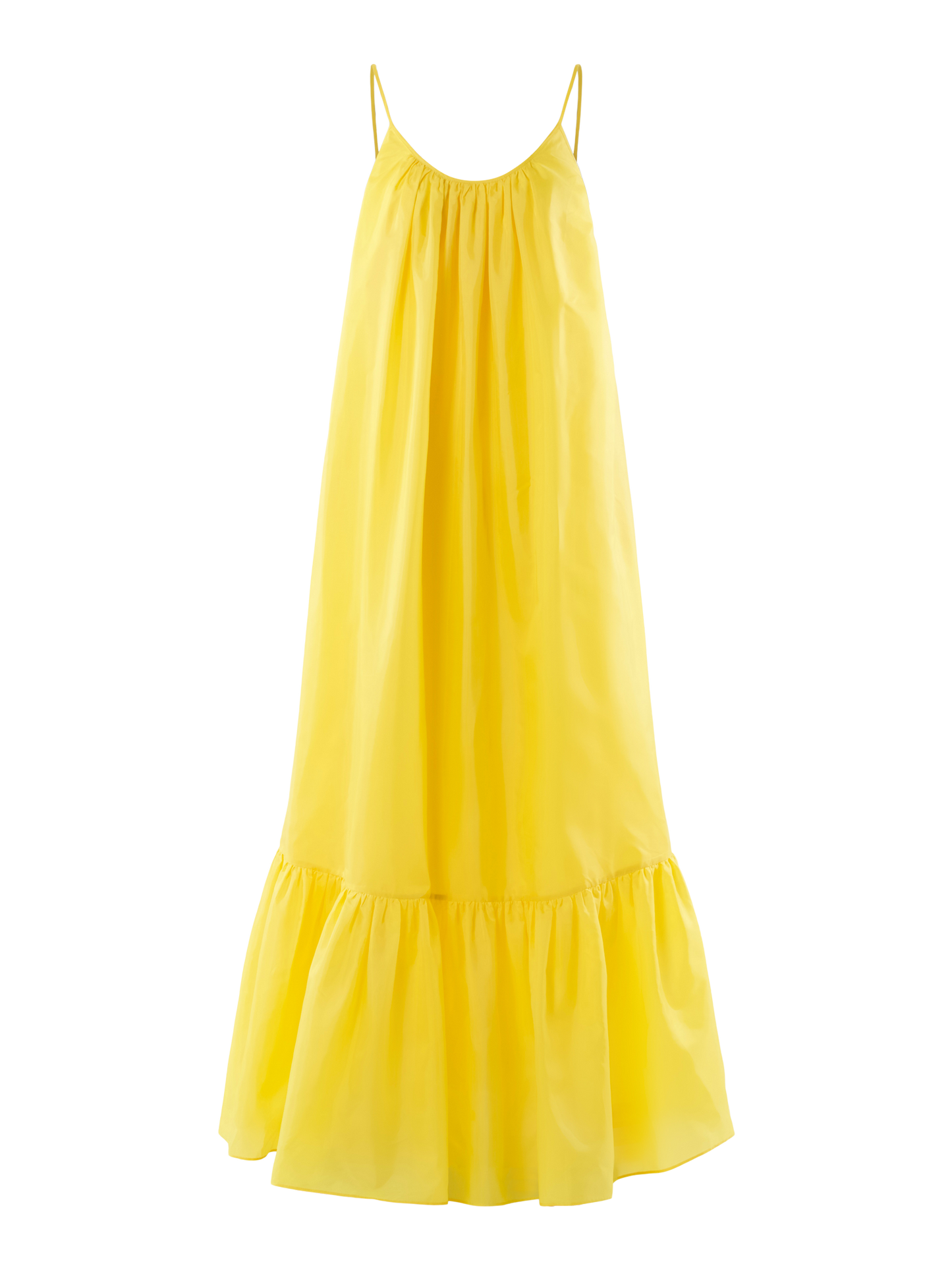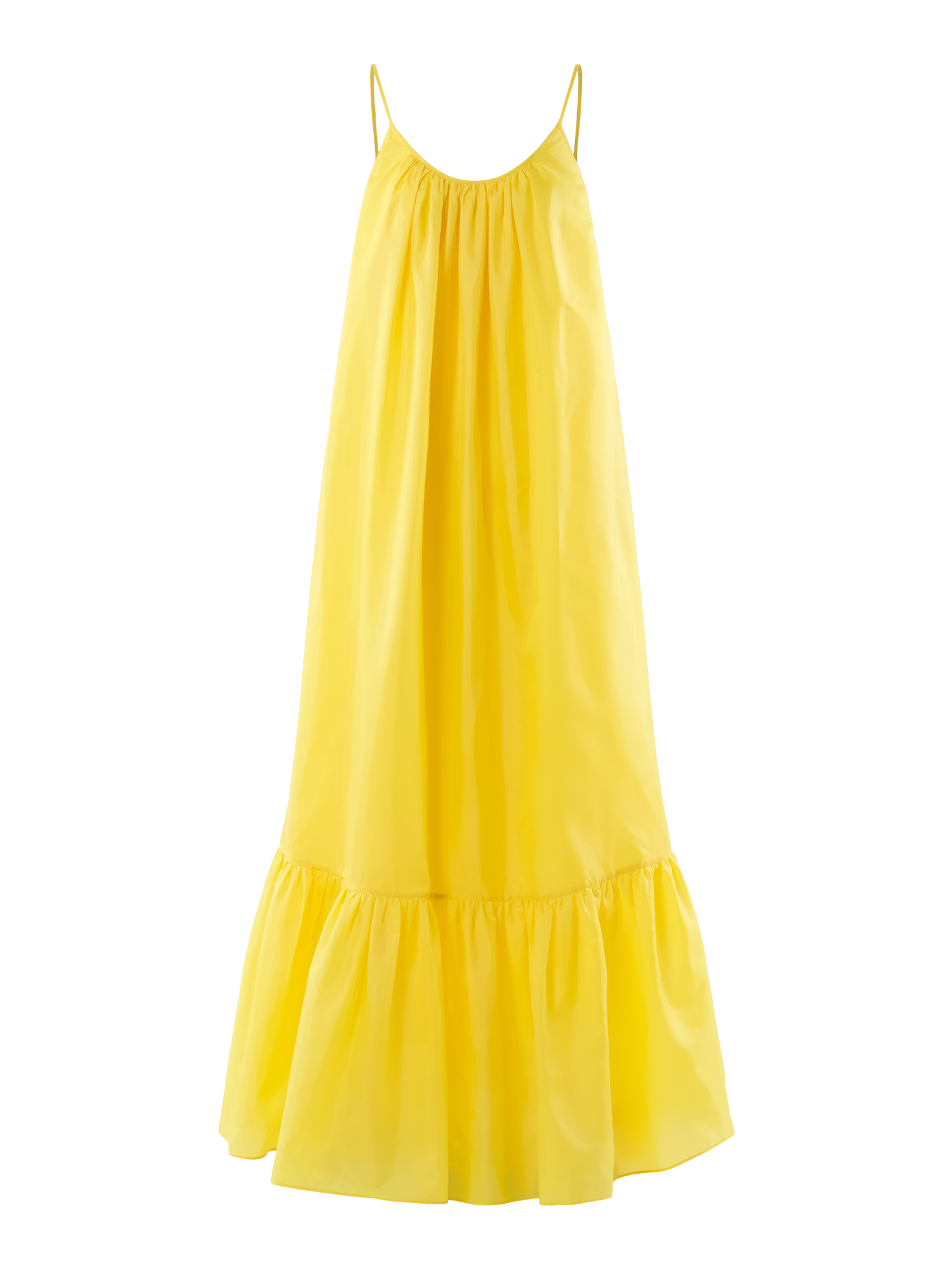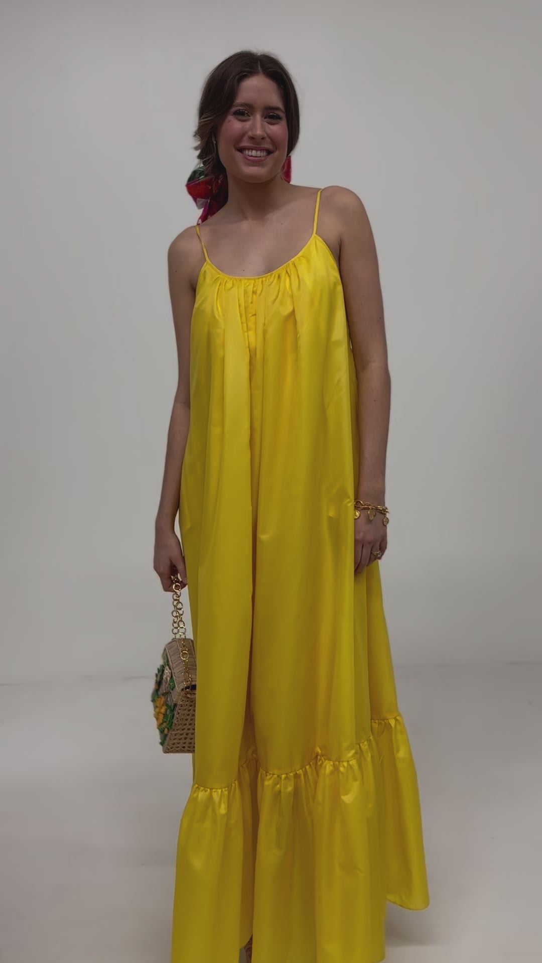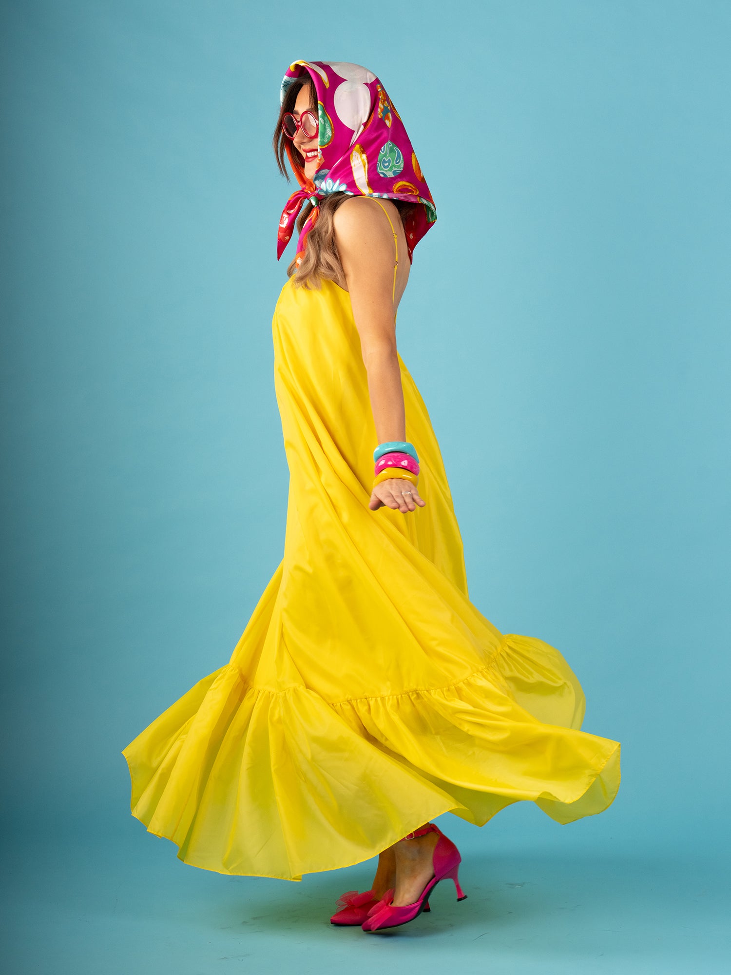 The Susannah Maxi in Lemon is a radiant standout, designed in a vibrant yellow taffeta that captures light and movement with every step. This exclusive Emily McCarthy style features slender spaghetti straps, a softly gathered neckline, and a dramatic scoop low back for an effortlessly feminine silhouette. Its voluminous, loose-fitting body flows into a wide ruffled hem for added flair and ease. Only available through Emily McCarthy, this piece is not carried by any of our retailers—making it a true collector’s gem for sunshine-filled wardrobes.
