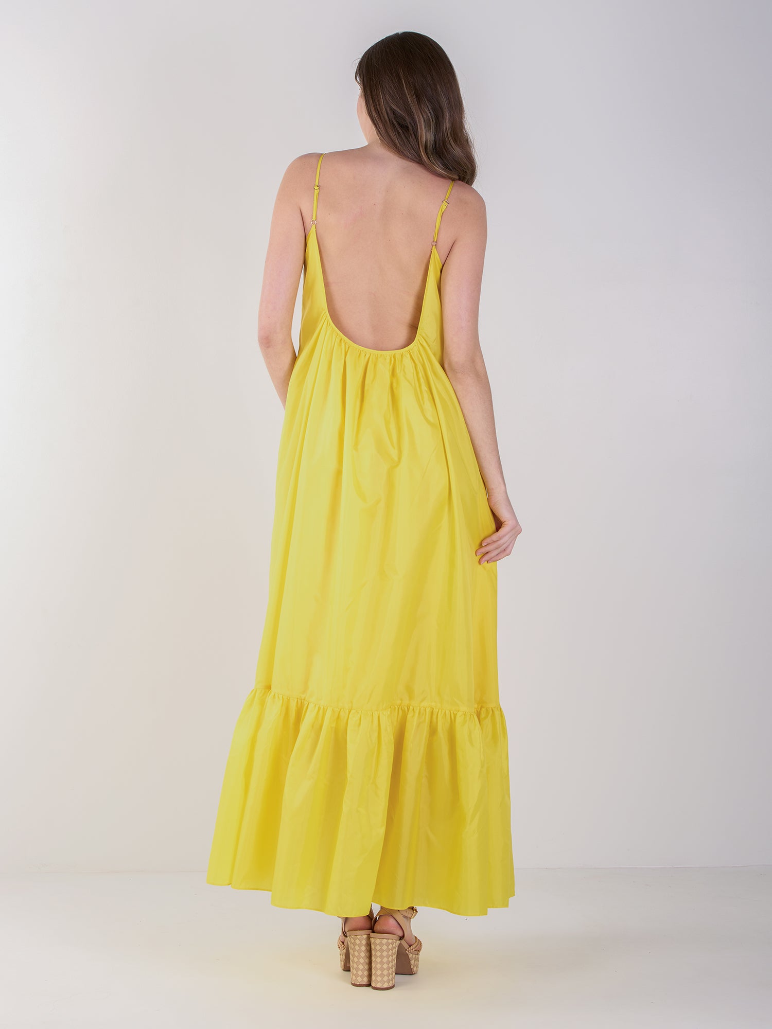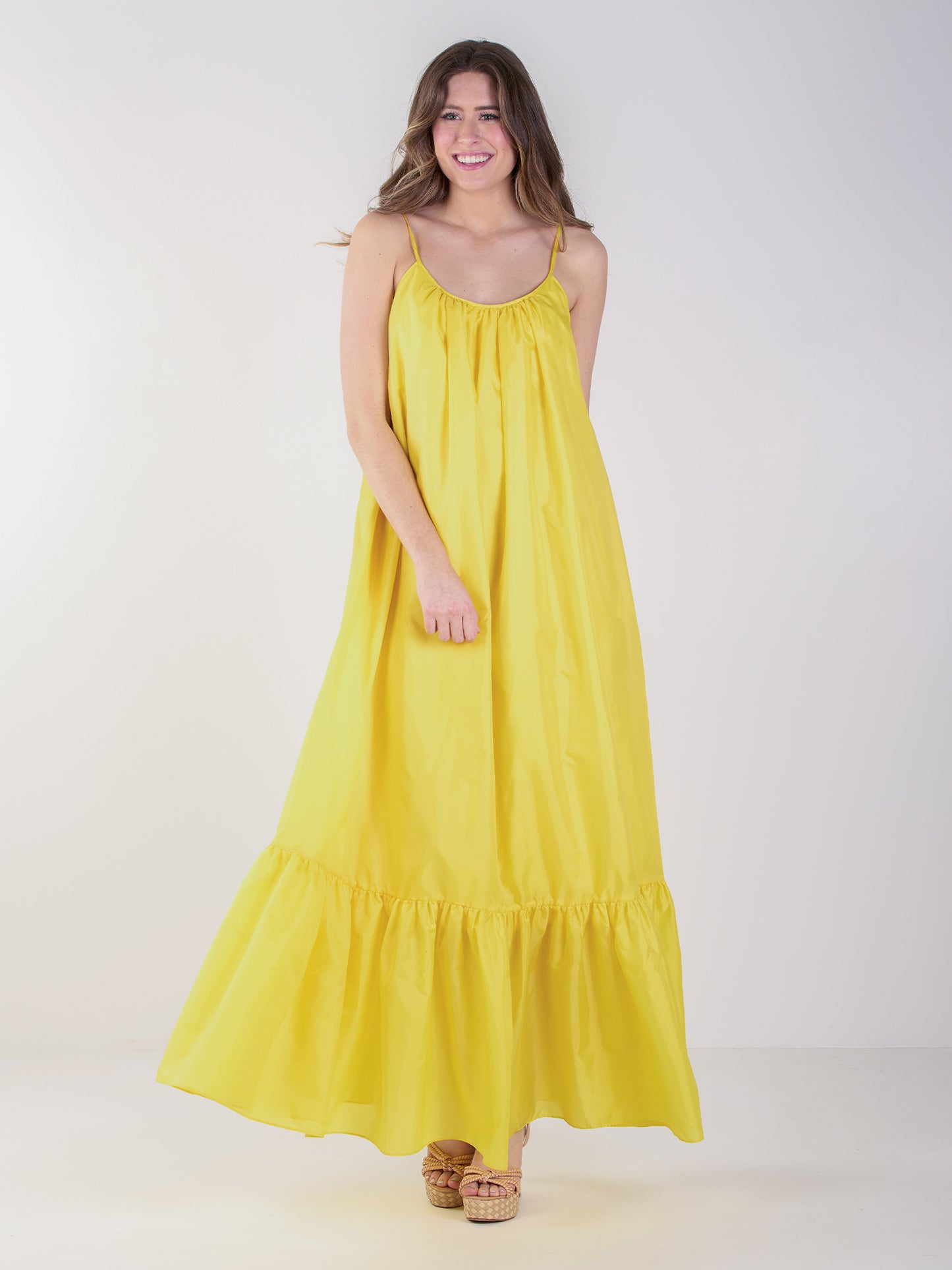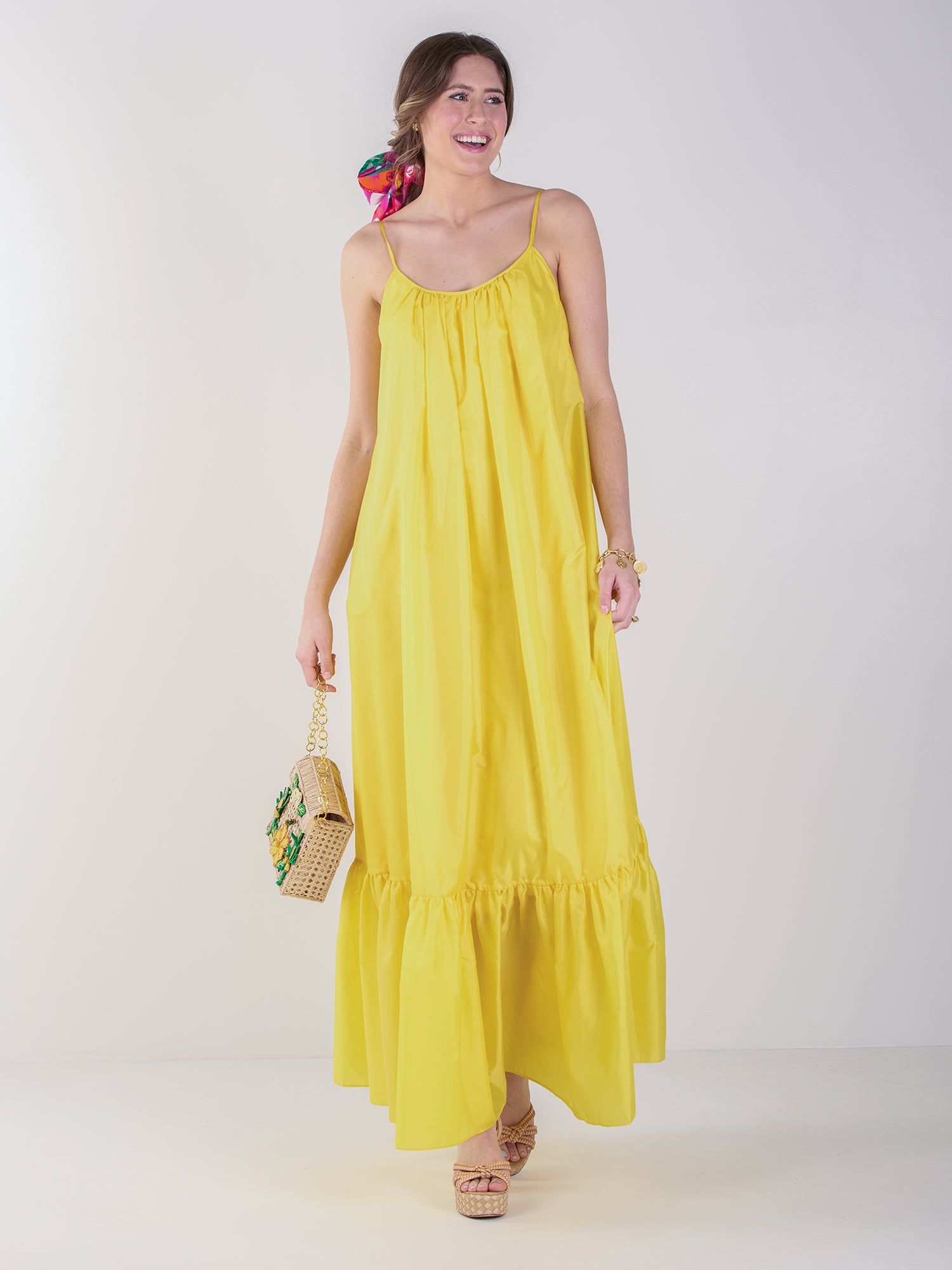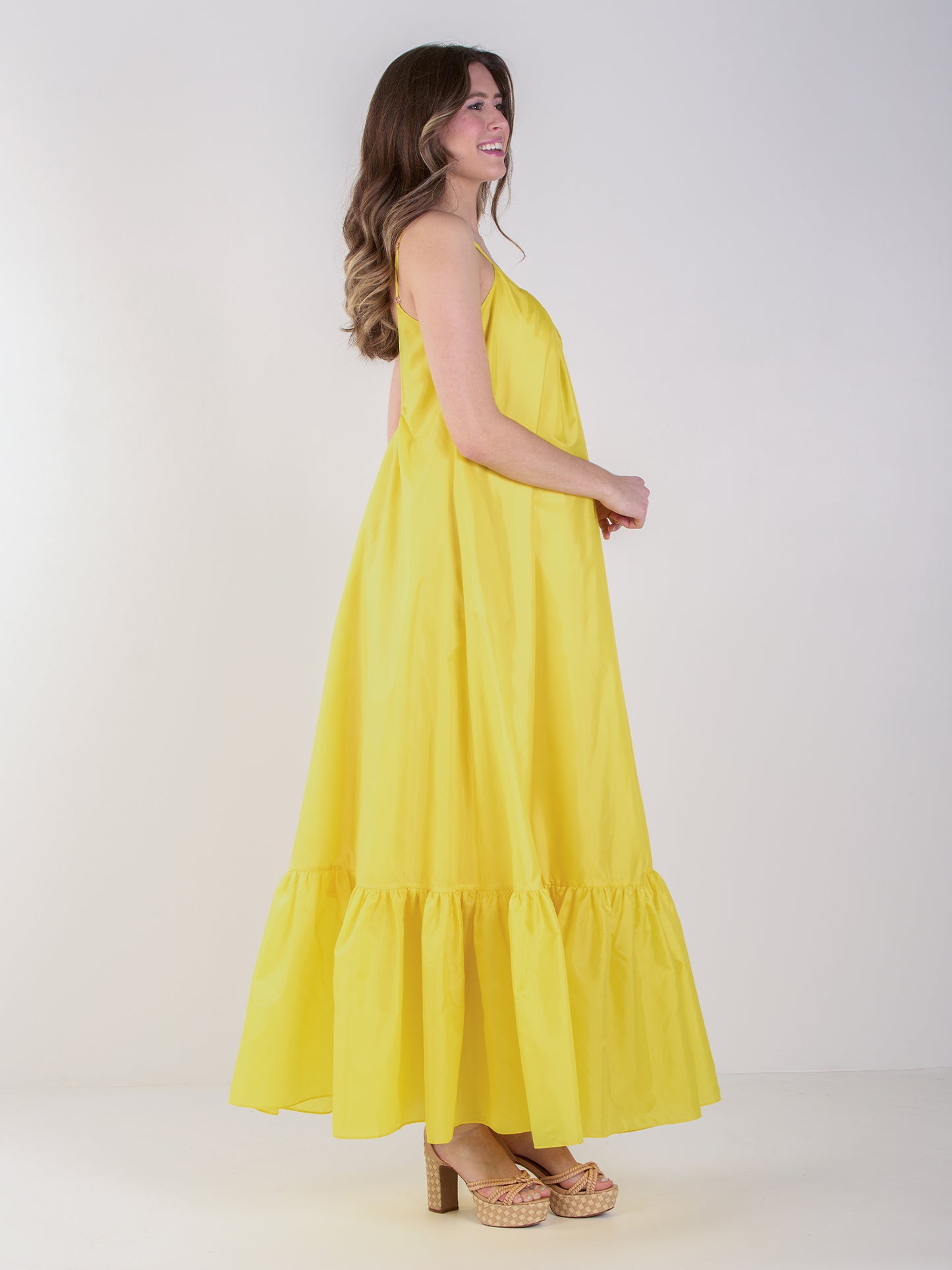 The Susannah Maxi in Lemon is a radiant standout, designed in a vibrant yellow taffeta that captures light and movement with every step. This exclusive Emily McCarthy style features slender spaghetti straps, a softly gathered neckline, and a dramatic scoop low back for an effortlessly feminine silhouette. Its voluminous, loose-fitting body flows into a wide ruffled hem for added flair and ease. Only available through Emily McCarthy, this piece is not carried by any of our retailers—making it a true collector’s gem for sunshine-filled wardrobes.