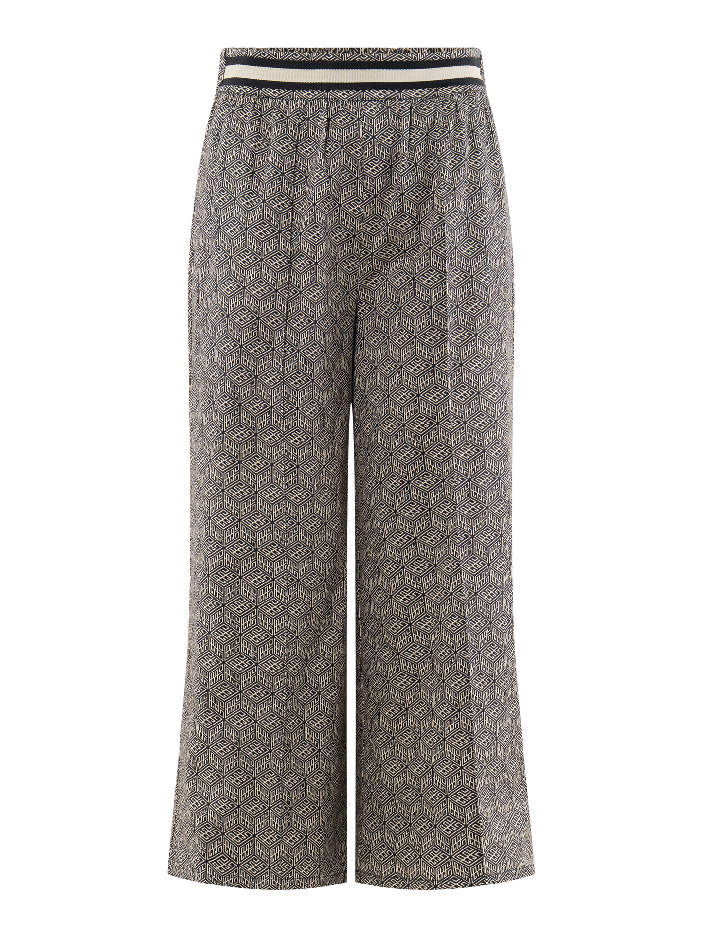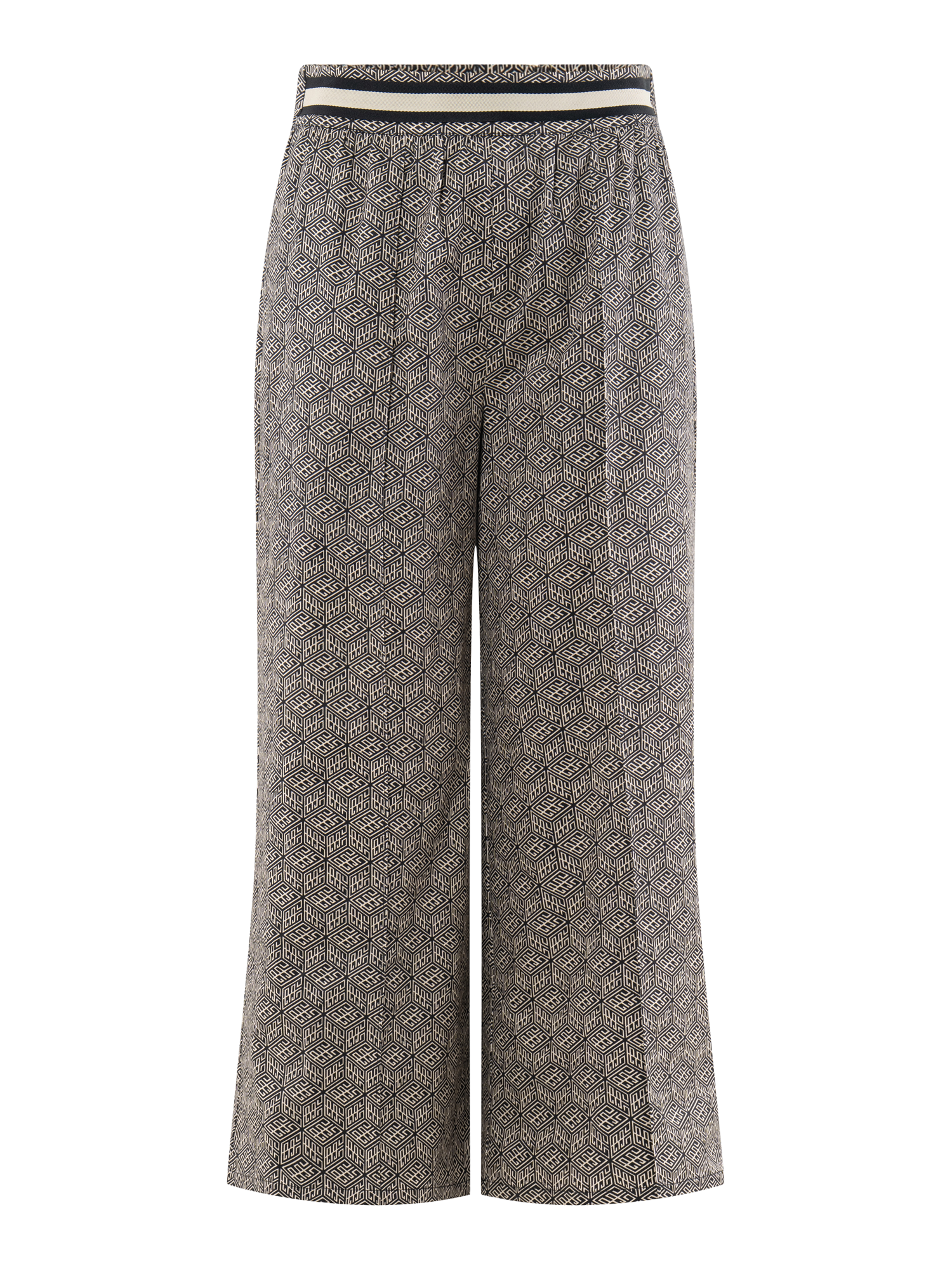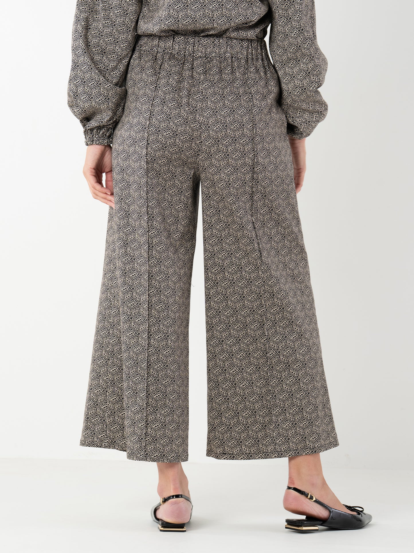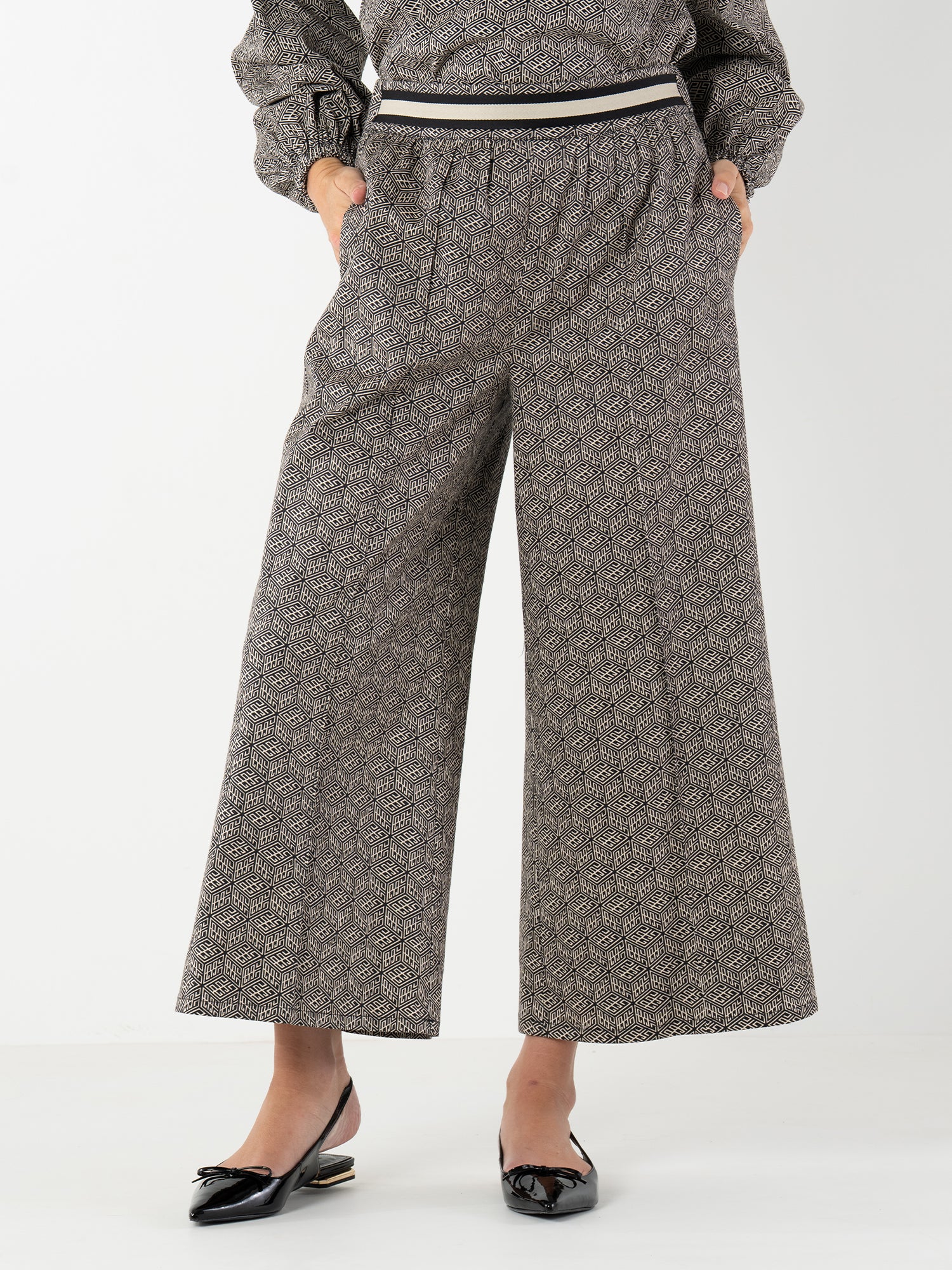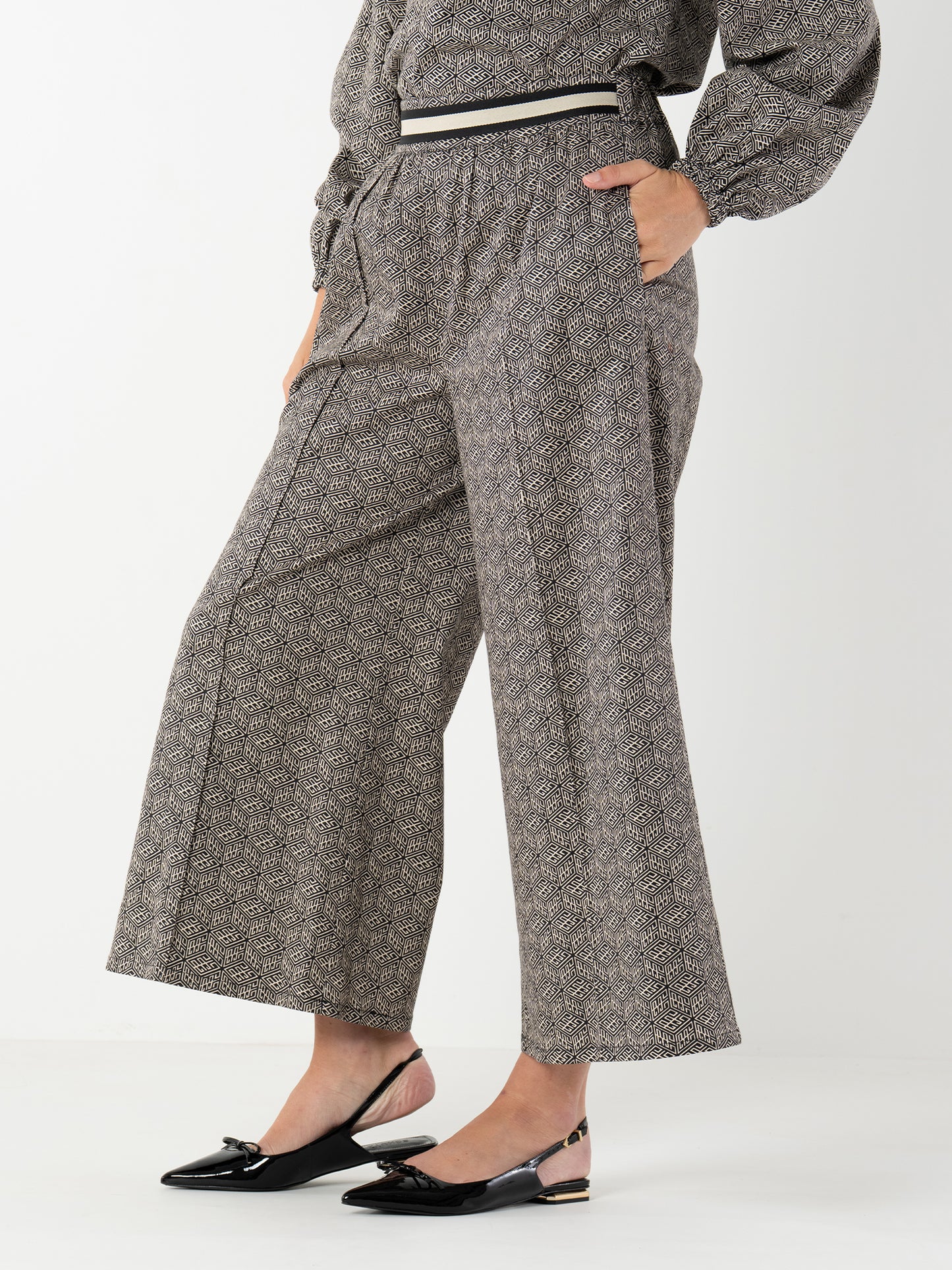 A modern take on laid-back style, the Teddy Crop Trouser features a relaxed wide leg silhouette with an elastic waistband and practical side pockets. The black and white striped trim adorns the waistline with a graphic pop, complementing the Black Tonal Monogram print—a subtle nod to the brand with our signature logo in a chic, repeating pattern. Designed for comfort and style, these cropped trousers offer a versatile foundation for elevated everyday dressing.