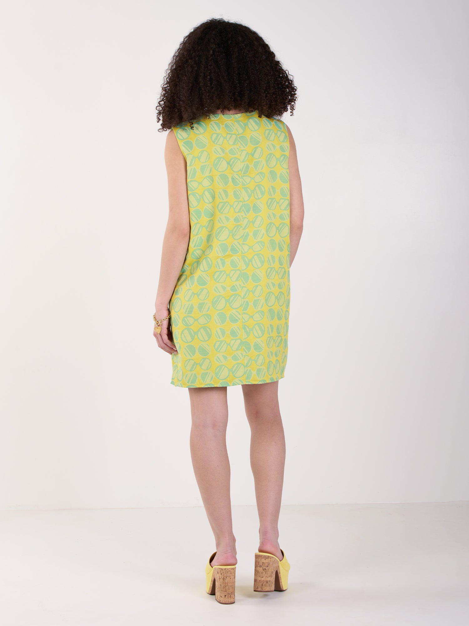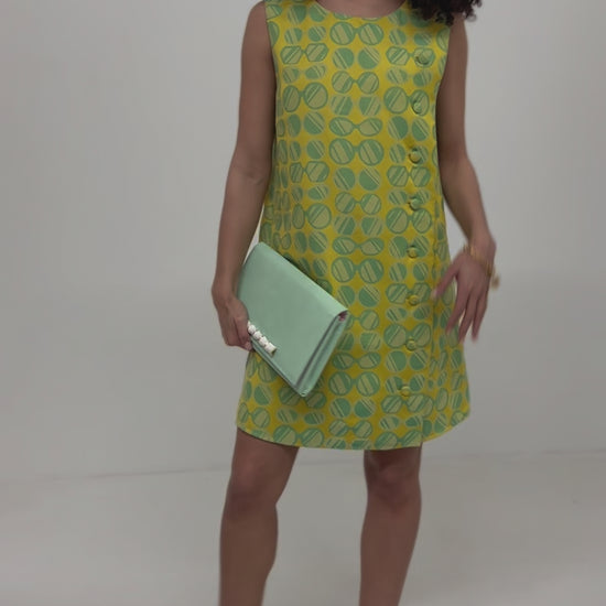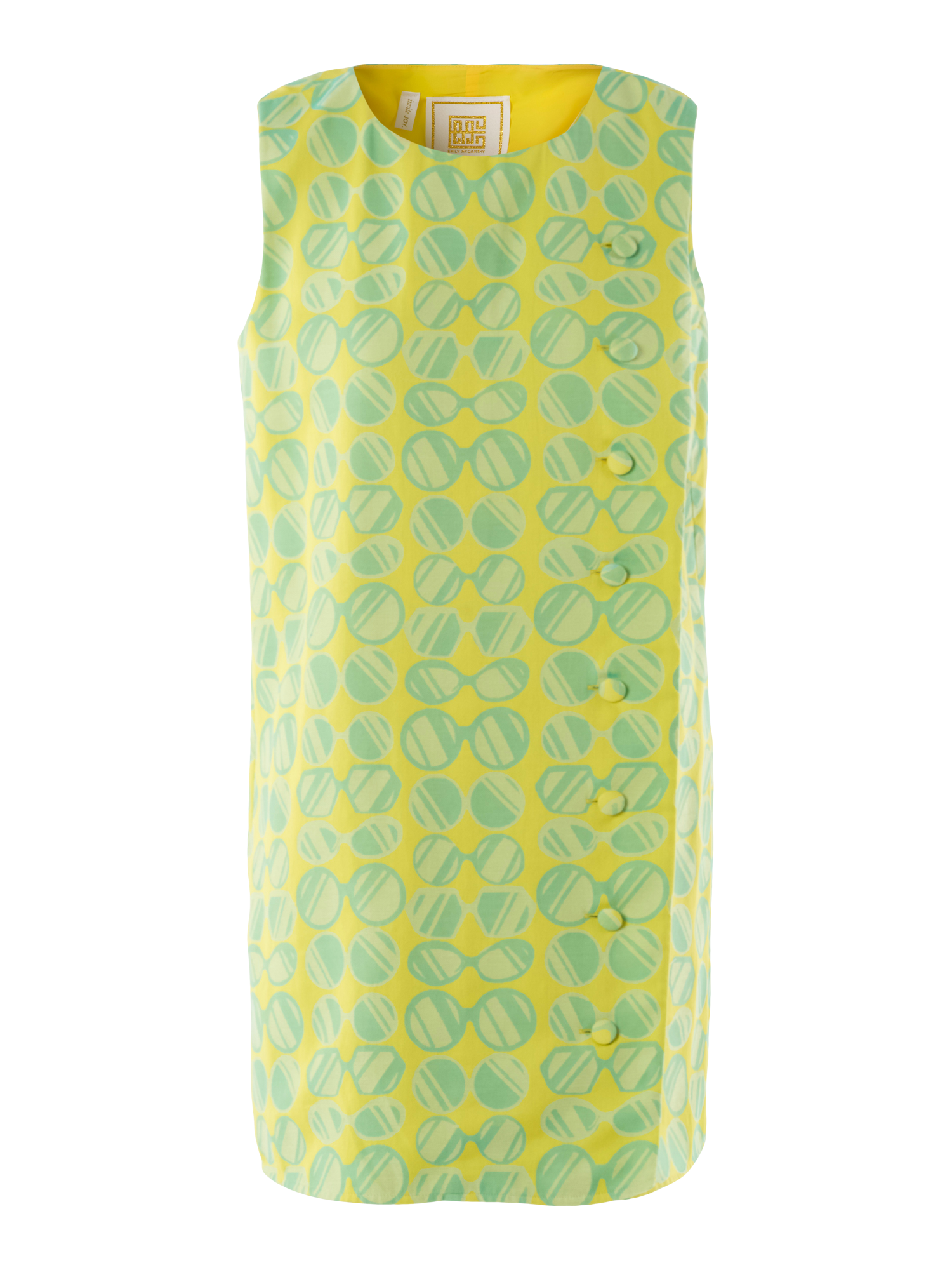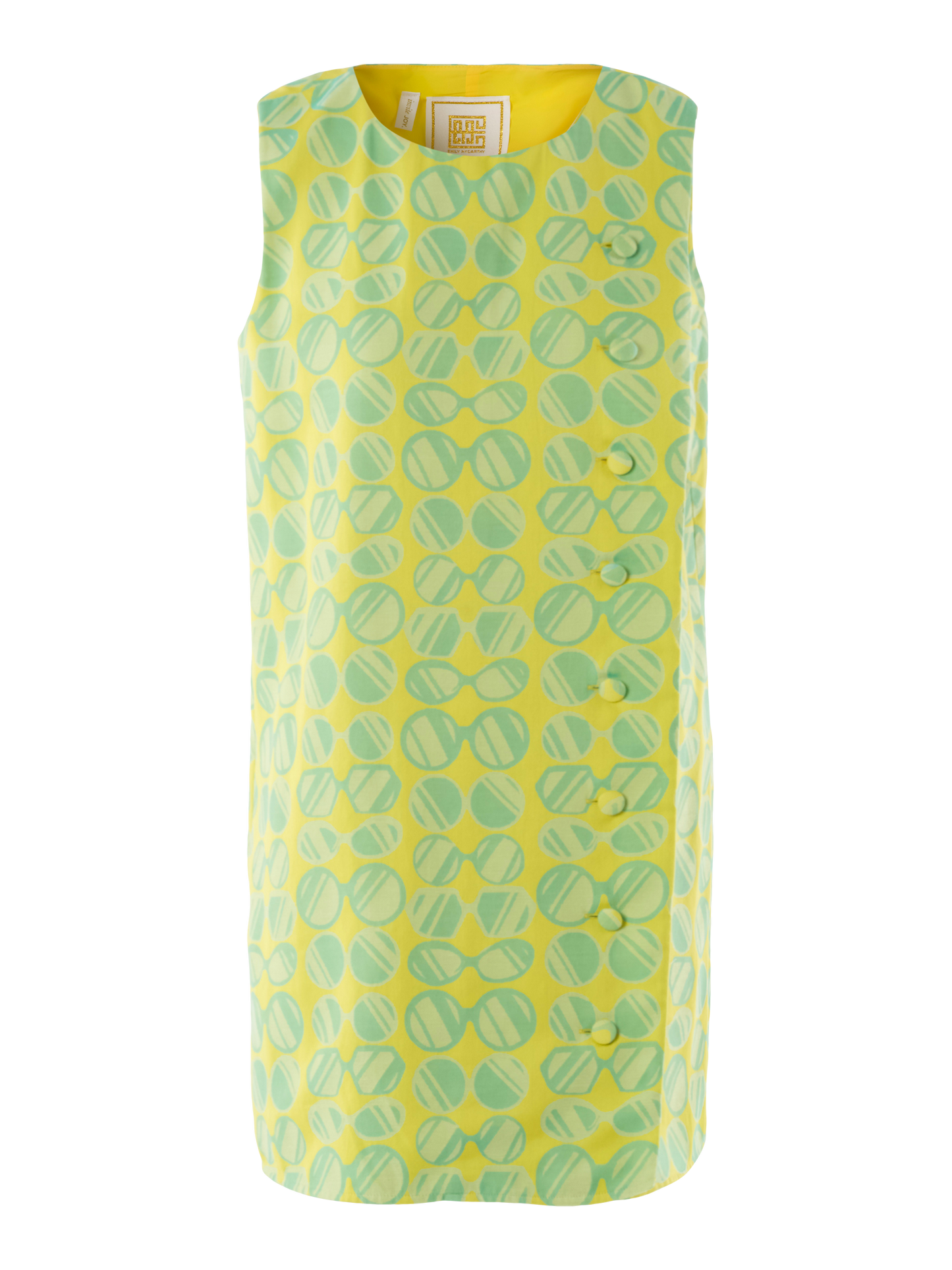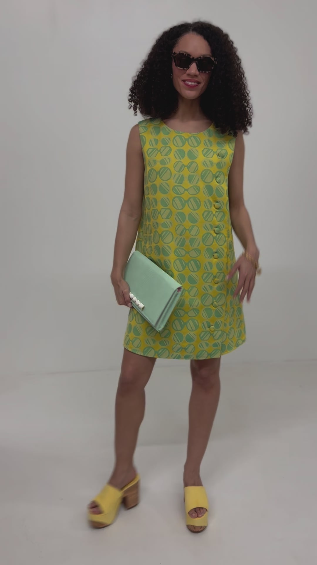 The Tory Dress in Spectacle is your new sunny-day essential, full of charm and personality. Designed in an easy, shift-style silhouette, this playful piece features a row of covered buttons cascading down one side for a touch of asymmetrical detail. The vibrant Spectacle print—an ode to Iris Apfel's iconic eyewear and fearless fashion—adds joyful character to your summer wardrobe. Effortless, eye-catching, and ready for anything.