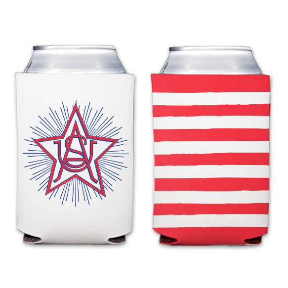 Collapsable neoprene drink koozie with our festive USA crest and stripes design. Perfect for any Fourth of July celebrations!