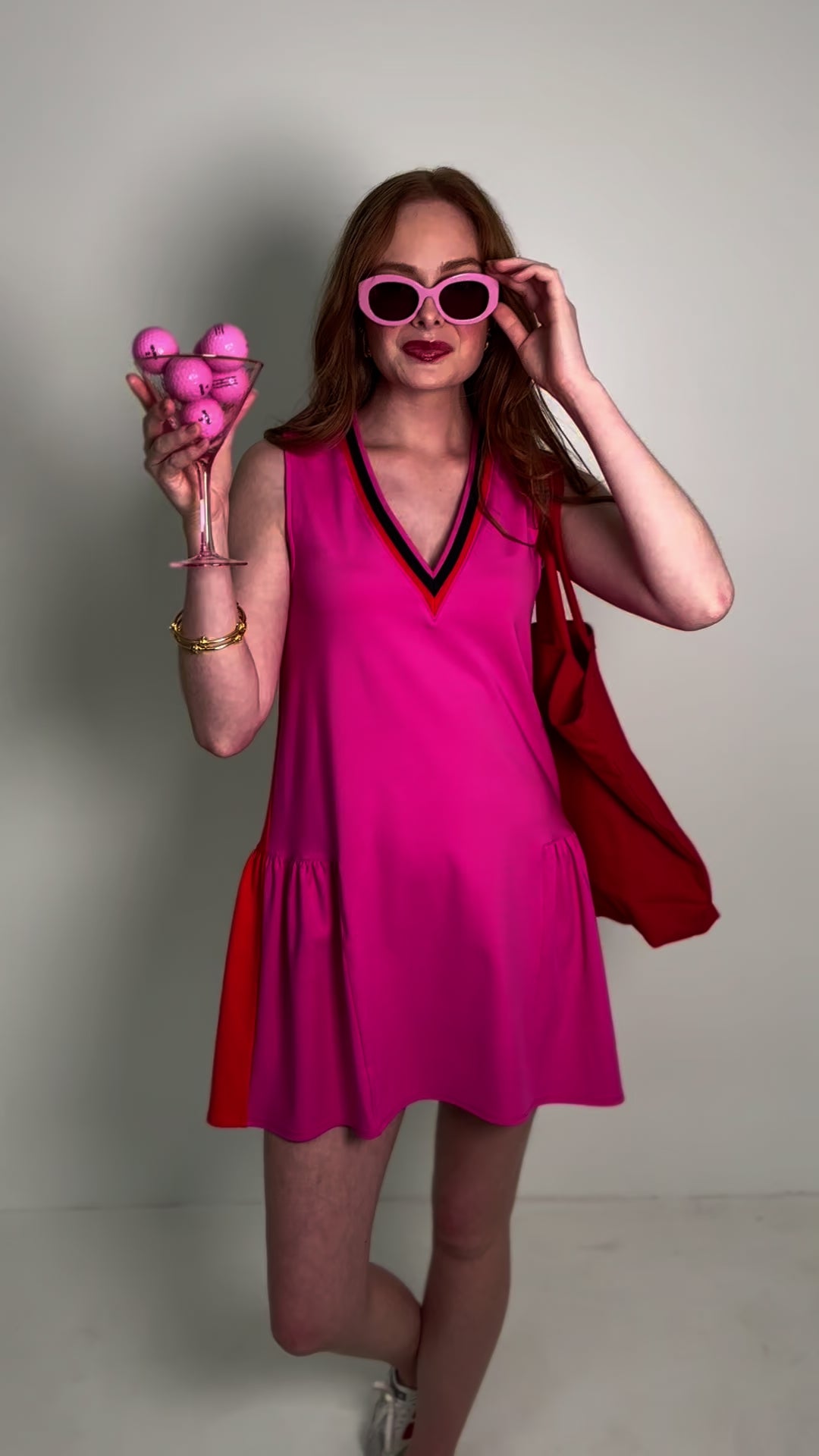 Adding a dose of feminine energy to your active lifestyle, the Varsity Daisy Dress in Berry Color Block takes sporty-chic style to the next level. This easy throw-on-and-go style features playful trim work along the V-neckline and a relaxed silhouette complimented with a drop waist seam. The performance fabric offers substantial stretch and support with cooling properties for all day comfort.